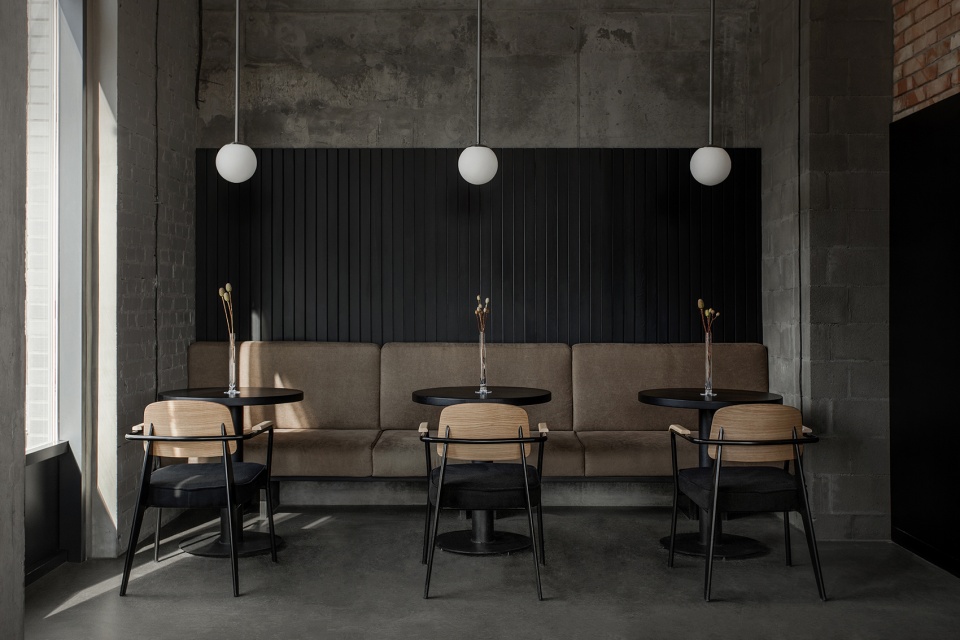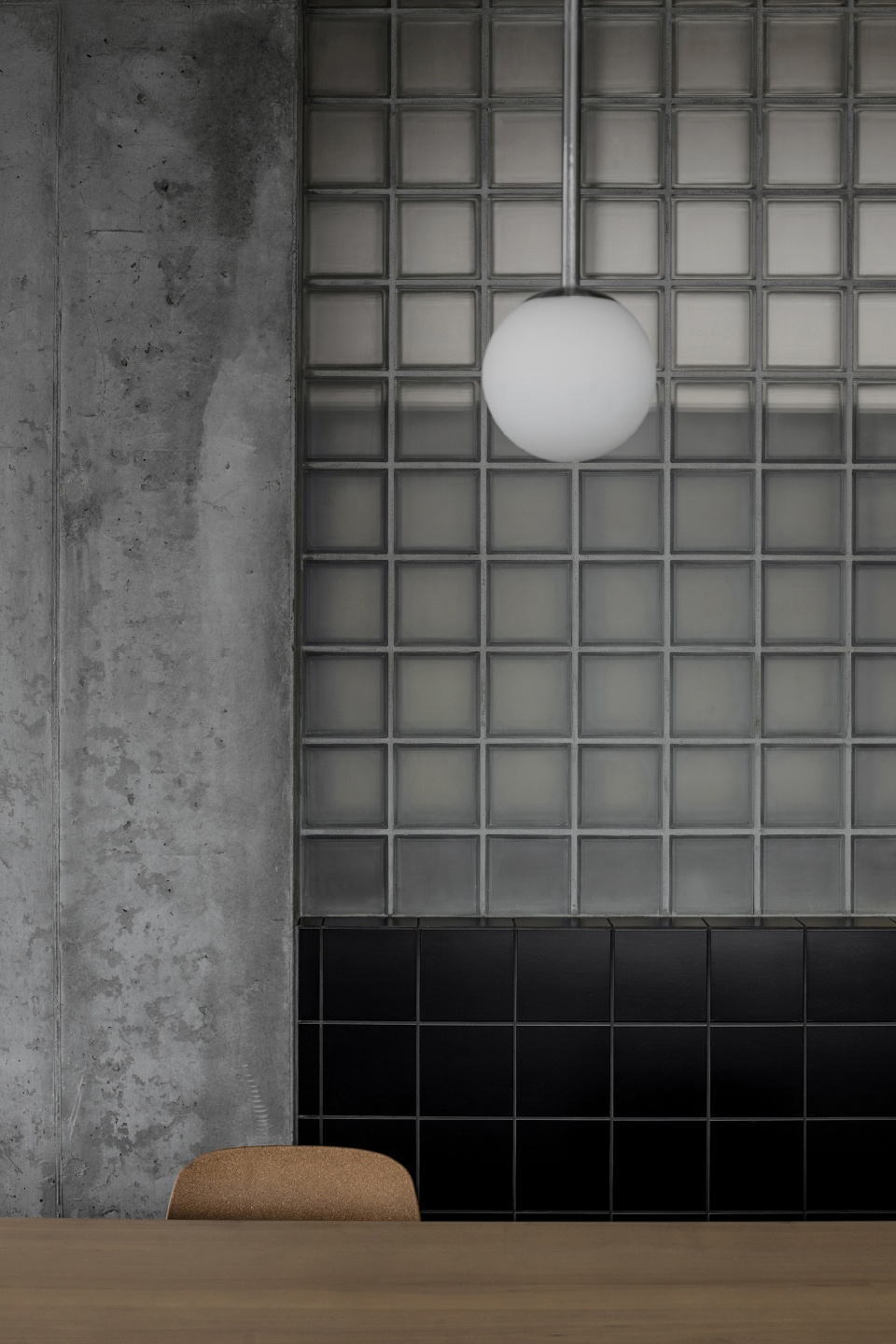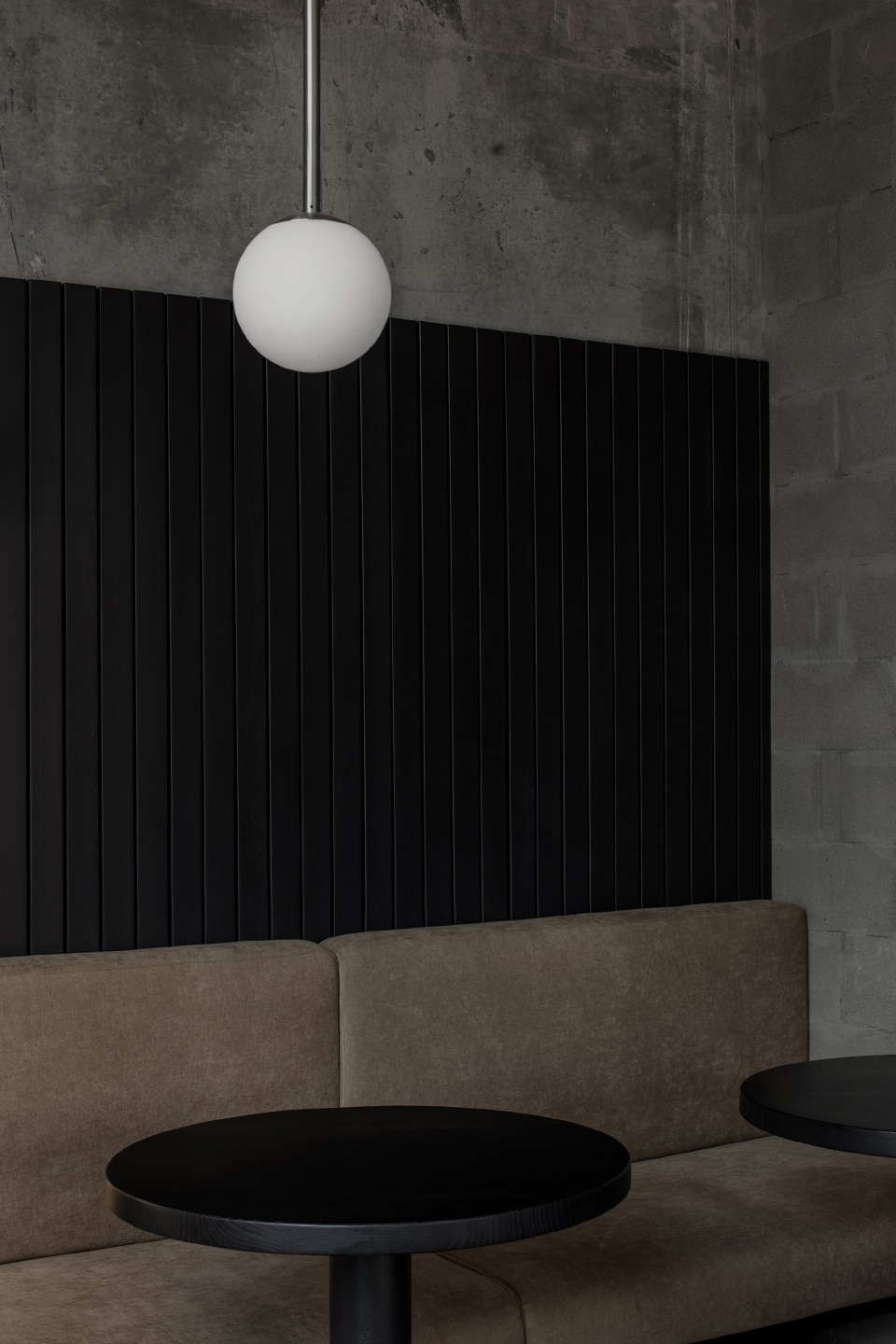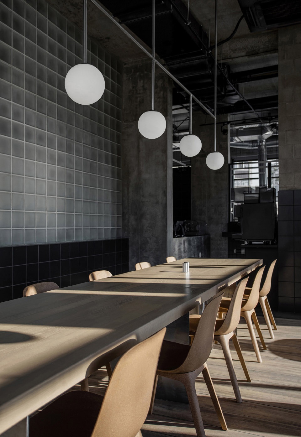 Minimalist pendant lights-spheres on steel legs, custom-made specifically for this project, are important details that visually unites all zones for visitors. Urban interior is complemented by brushed steel elements and graphic walls in small black tiles, while ash wood furniture and lights-spheres create a cozy atmosphere.
