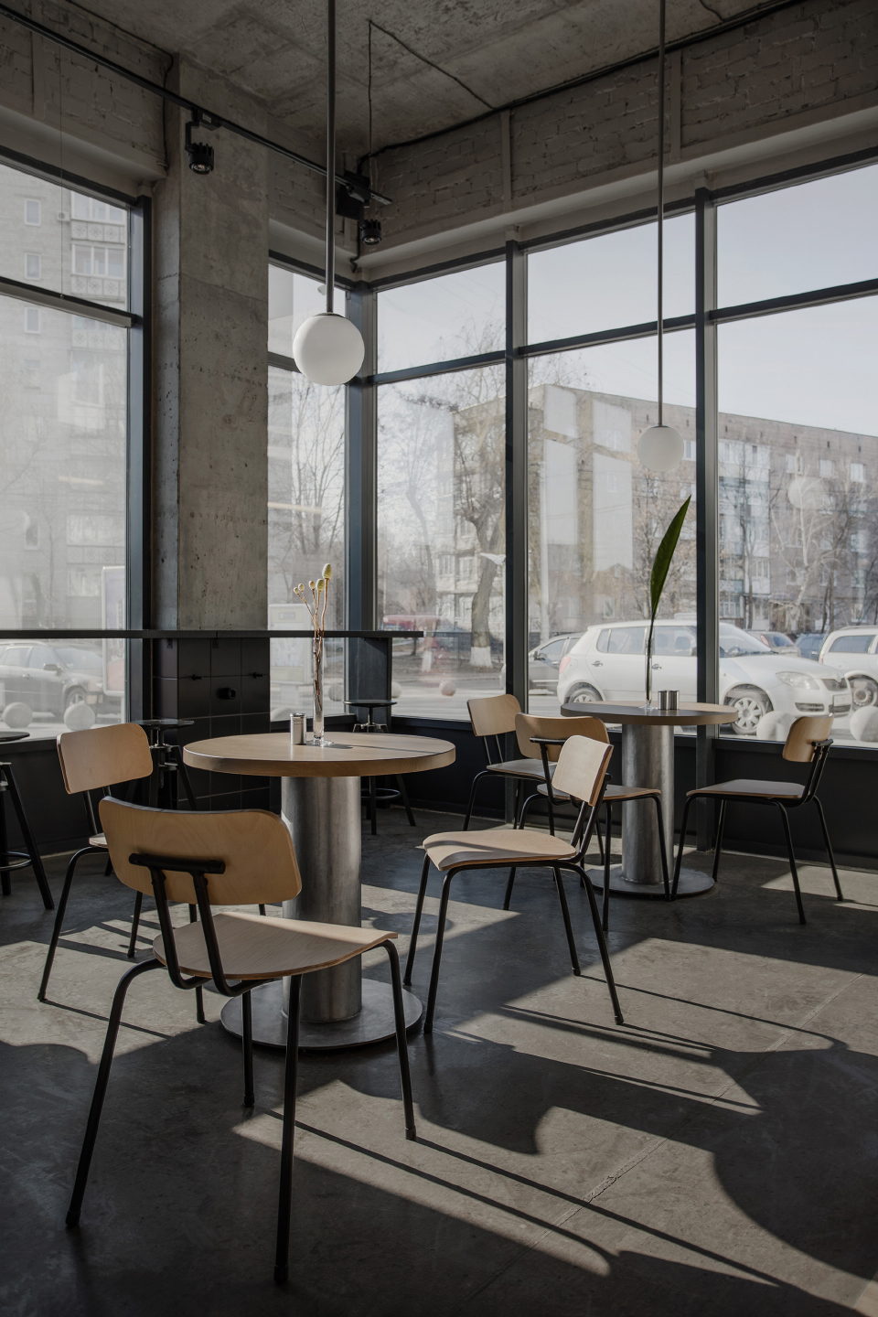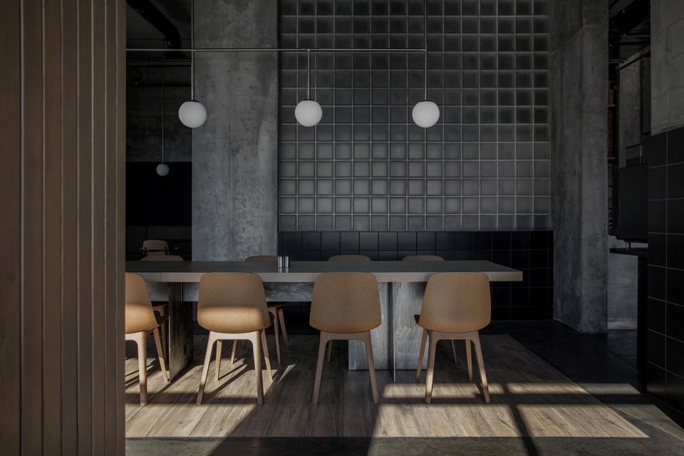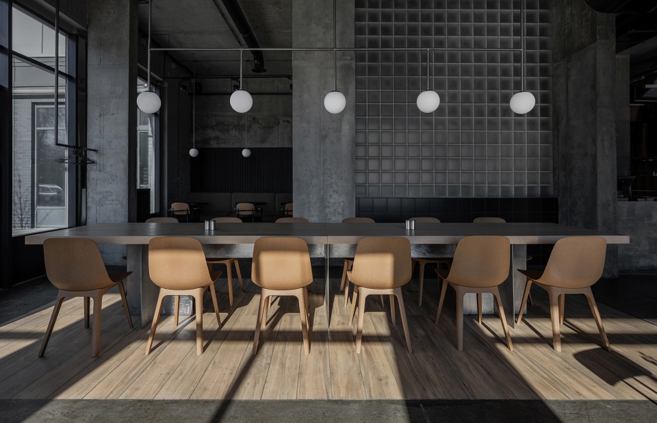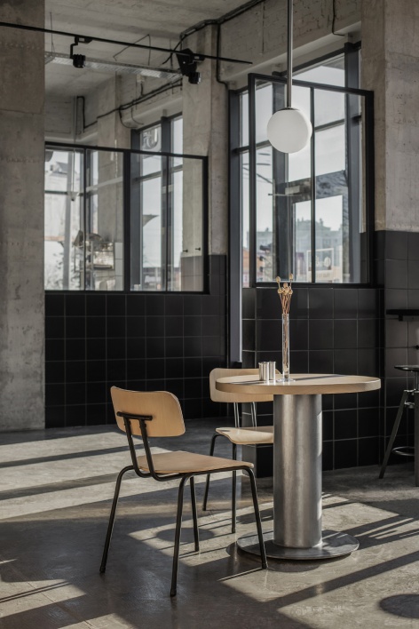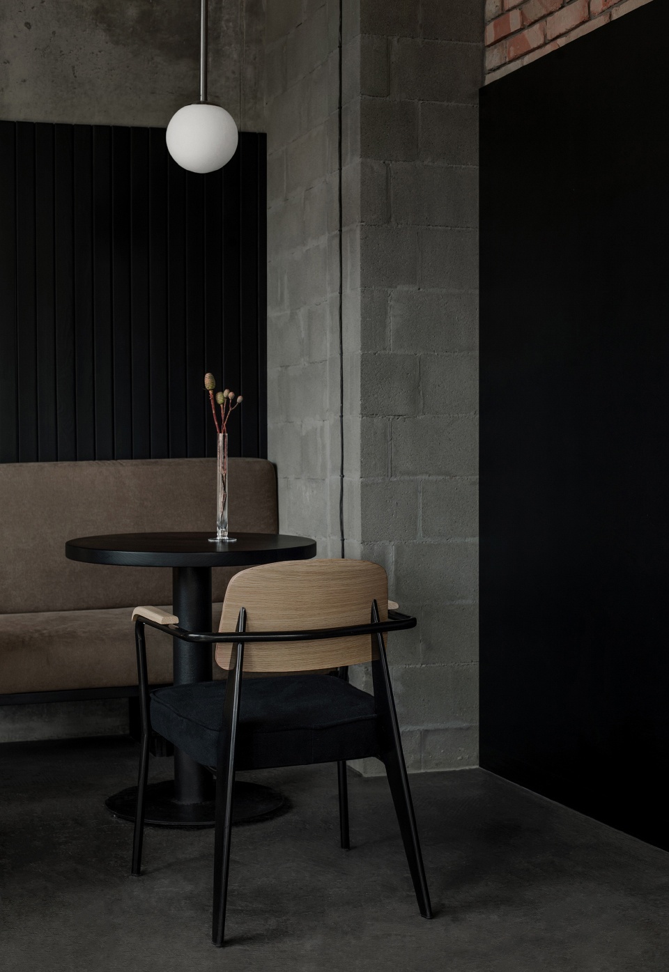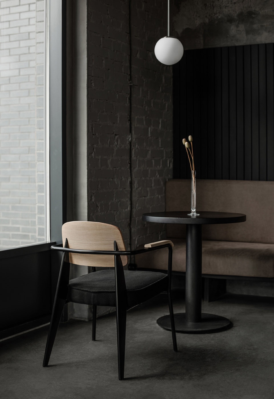 Minimalist pendant lights-spheres on steel legs, custom-made specifically for this project, are important details that visually unites all zones for visitors. Urban interior is complemented by brushed steel elements and graphic walls in small black tiles, while ash wood furniture and lights-spheres create a cozy atmosphere.