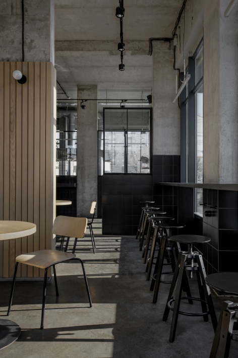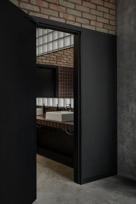 The main concept of interior was to preserve the appearance of original materials and focus on the combination of textures. Concrete ceiling, columns, blocks, brick walls have pristine appearance.