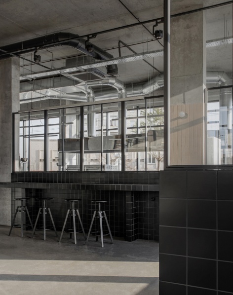 室内一侧的全景窗户由黑钢框架和玻璃隔断组成,使得整个空间明亮且通风,增强了空间的开放感,让顾客感到更为亲近。
