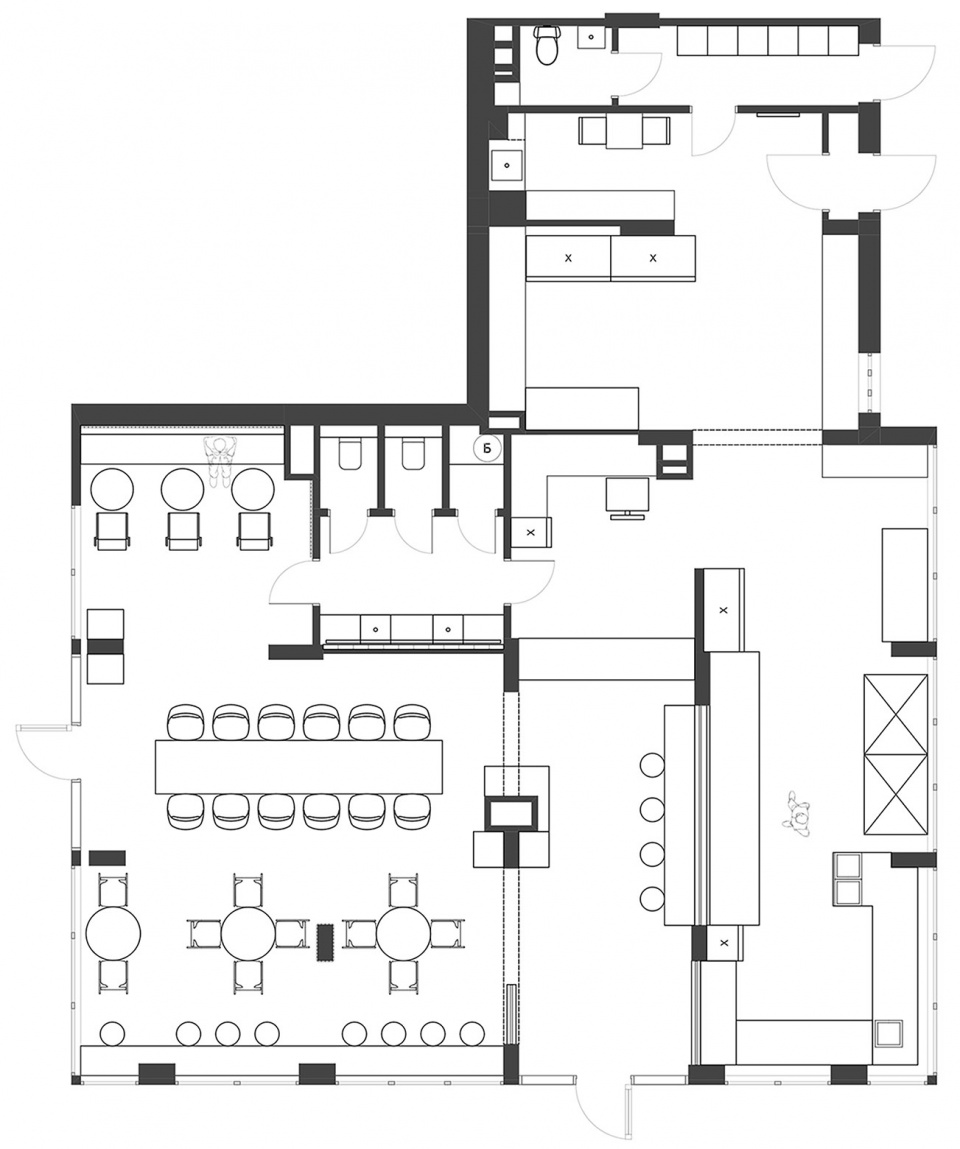 店内的空间被划分为两部分:开放式厨房和顾客区。这两部分由带玻璃隔板的吧台隔开,使得顾客可以参观烹饪过程。顾客区包含三个部分:灯光昏暗的舒适休息区,摆有沙发和躺椅;拥有长达五米的大型餐桌的中央就餐区;以及一个沿着窗户的吧台区。