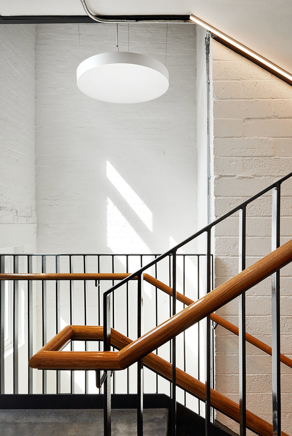 We expressed the steel frame and used a robust material palette of exposed timber floors, joists and rough brick walls to give the space a strong identity to attract TMT tenants looking for a distinctive space for their business.