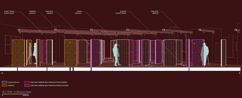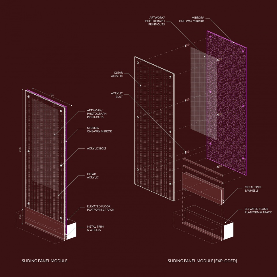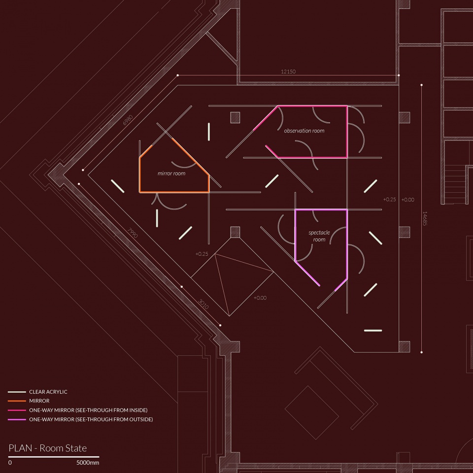 “观察房间”是透明度最高的空间。房间外的人可以看到里面的人,而里面的人只能看见被无限反射的人物照片。