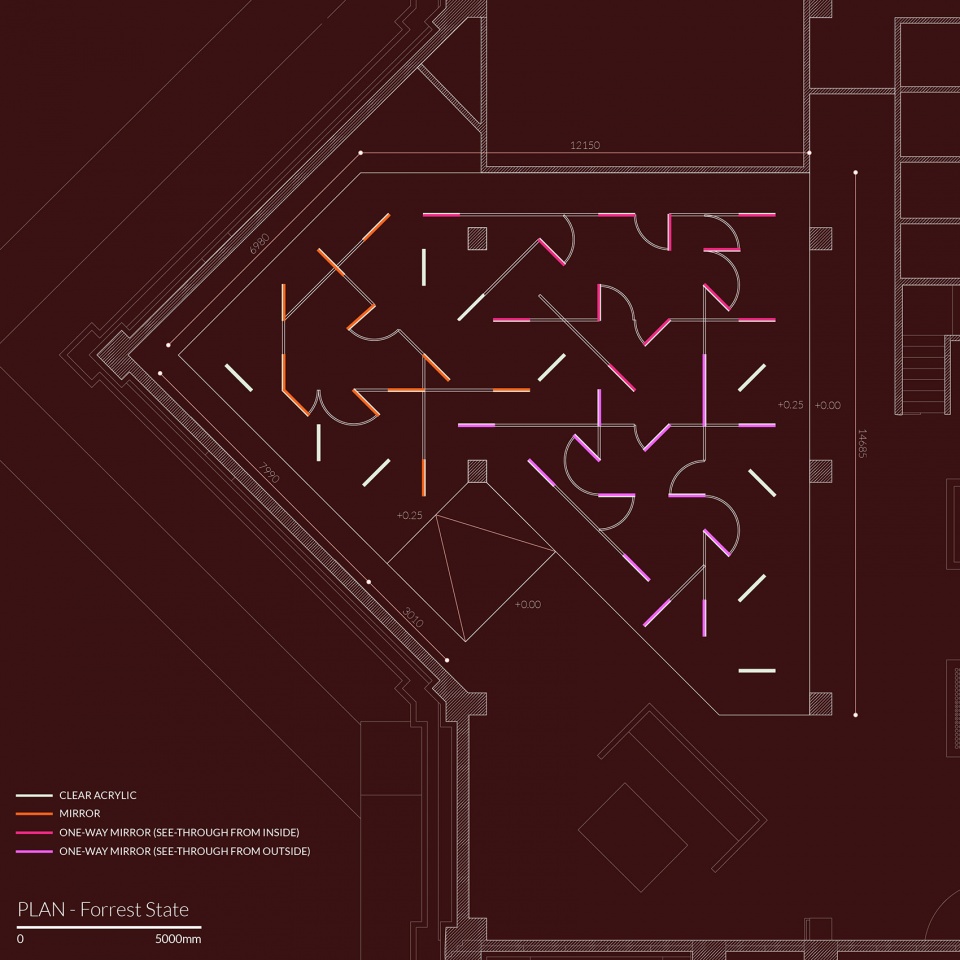 “镜子房间”是最为荫蔽的一个空间,其内外墙壁均覆盖以反射镜面,如同隐形一般,将自身掩蔽在照片和游客的倒影中。