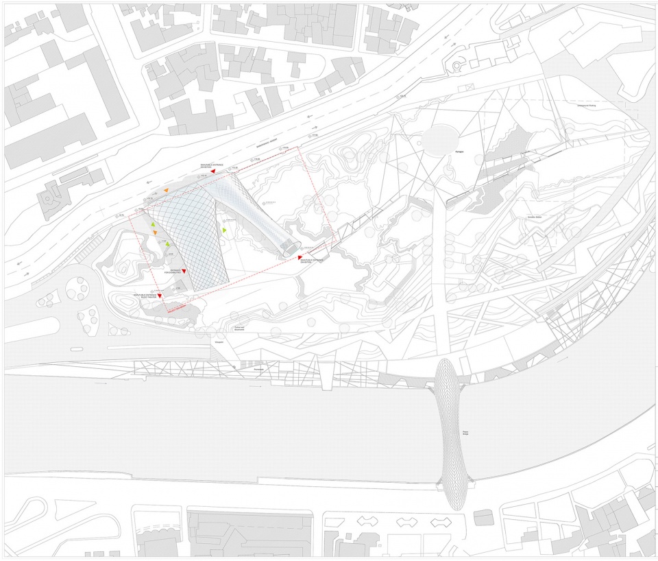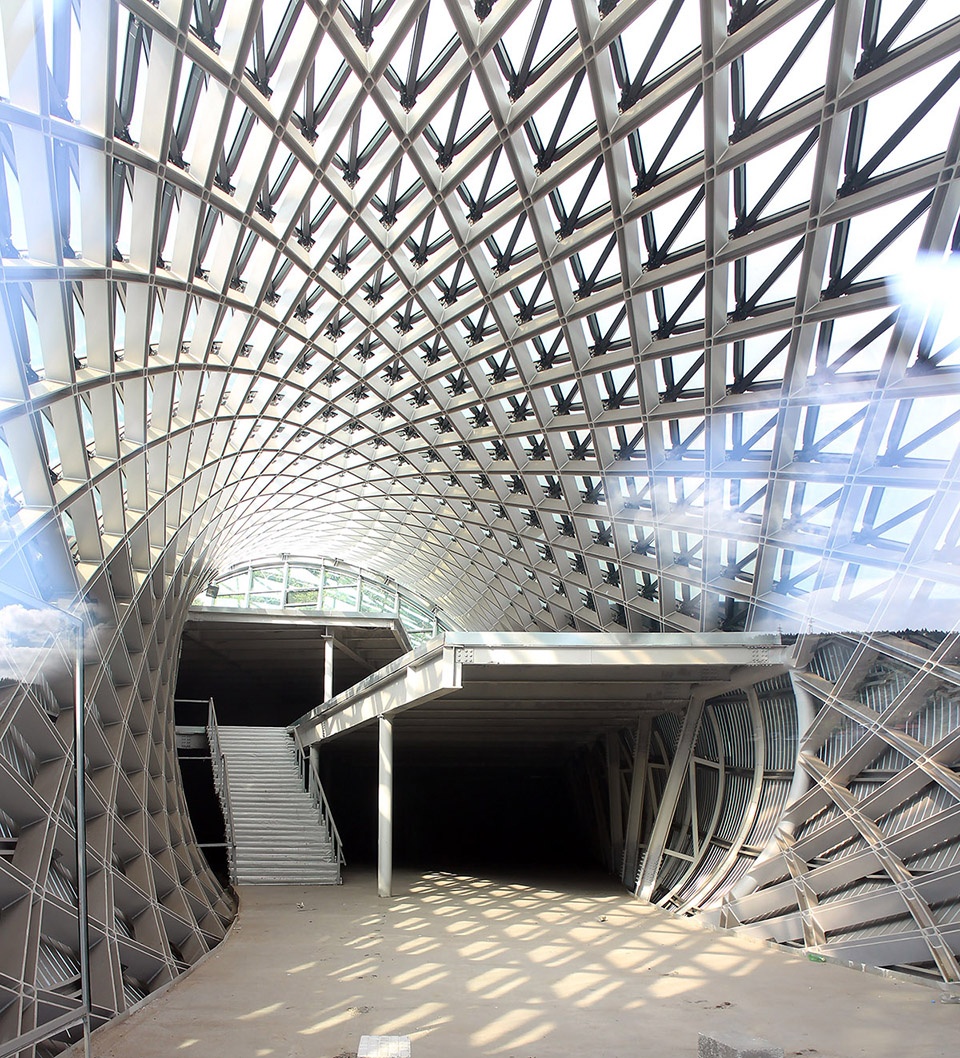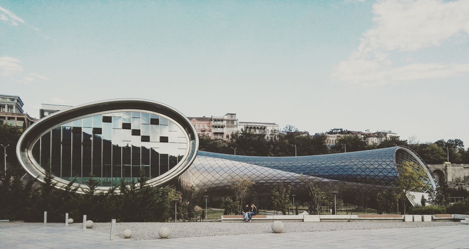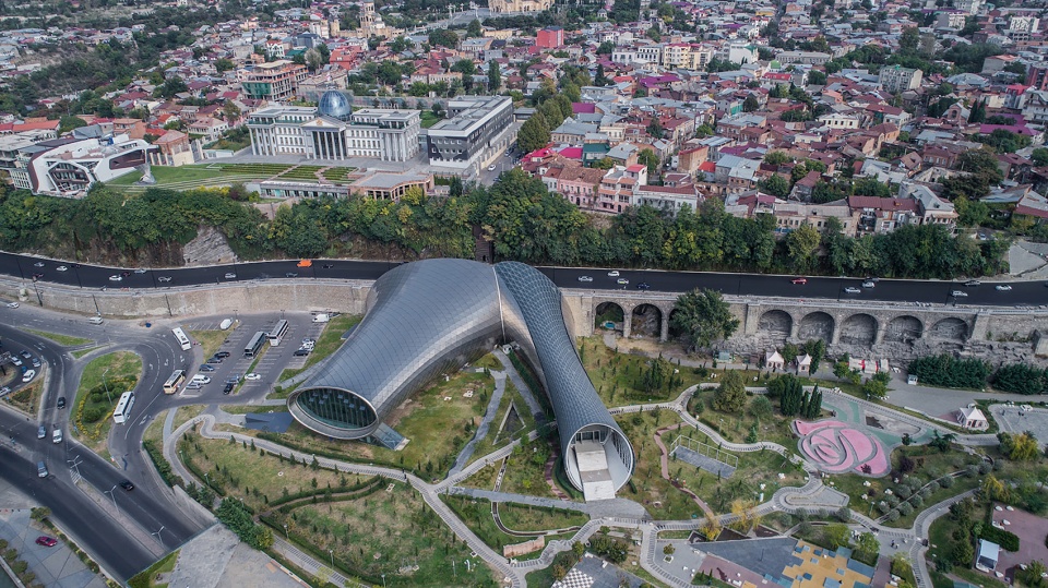 该项目位于格鲁吉亚第比利斯的城市绿地Rhike公园中。建筑由两个造型不同的体块组成,并由挡土墙连接成为一个整体。两个建筑体块都采用了软体造型,分别作为音乐剧场和展厅。