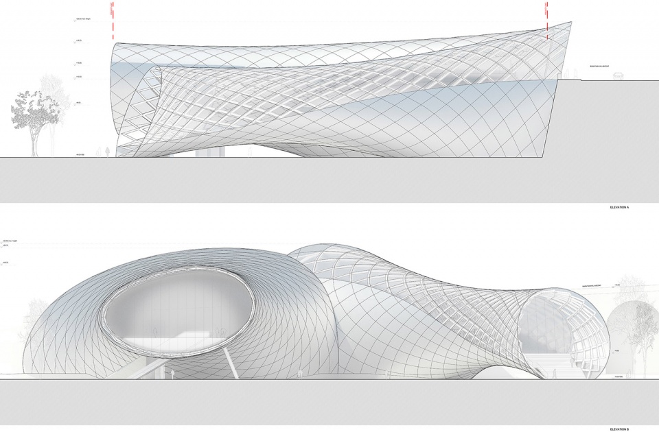 The project site is located inside the green area called Rhike Park, in Tbilisi, Georgia. The building consists of two different soft shaped elements that are connected as a unique body at the retaining wall. Every element has his own function: The Musical Theatre and the Exhibition Hall.