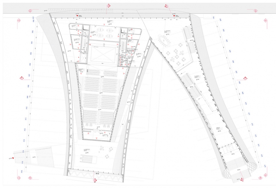 The north part of the building contains the Musical Theatre Hall (566 seats), the foyer and several facilities, together with technical spaces for theatre machinery and various storages. The Exhibition Hall opens his great entrance with a ramp that brings visitors from the street level. The Music Theatre Hall, on the contrary, soars from the ground and allows the users staying in the foyer and in the cafeteria to have a view to the river and the skyline of the city. It is a periscope to the city and looks towards the river framing the historic core of the Old Tbilisi.