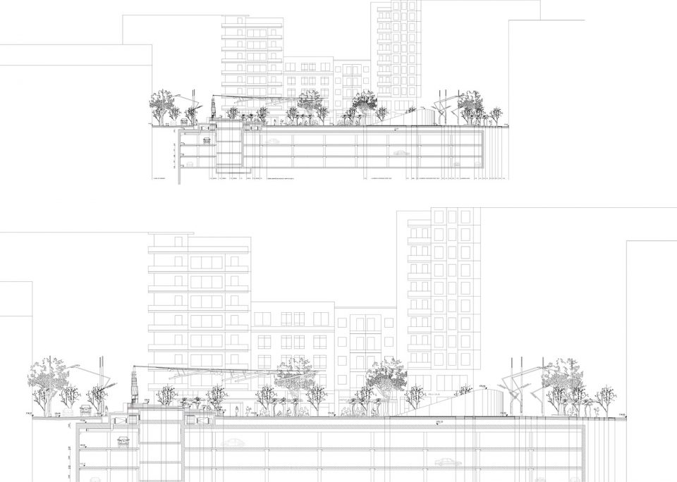 广场由绿地分割,其中的树木和矮灌木从道路上就可以看到。围绕这些绿地形成了不同的居民休闲活动区域,包括酒吧、儿童游乐场、长椅以及人行步道。两条进入广场的街道为天然石铺制,禁止车辆通行;道路边新种了树木并设置了小型绿化空间,标识出周边住宅楼的入口。圆圈的一侧设有大量雕塑型光源,可以照亮整个广场,同时体现了拥有公共空间的社区和街头派对概念,成为了集体认同的一环。圆圈的中央建造了一座新的雕塑,它将成为区域的地标,使这里从城市的其他区域中脱颖而出。