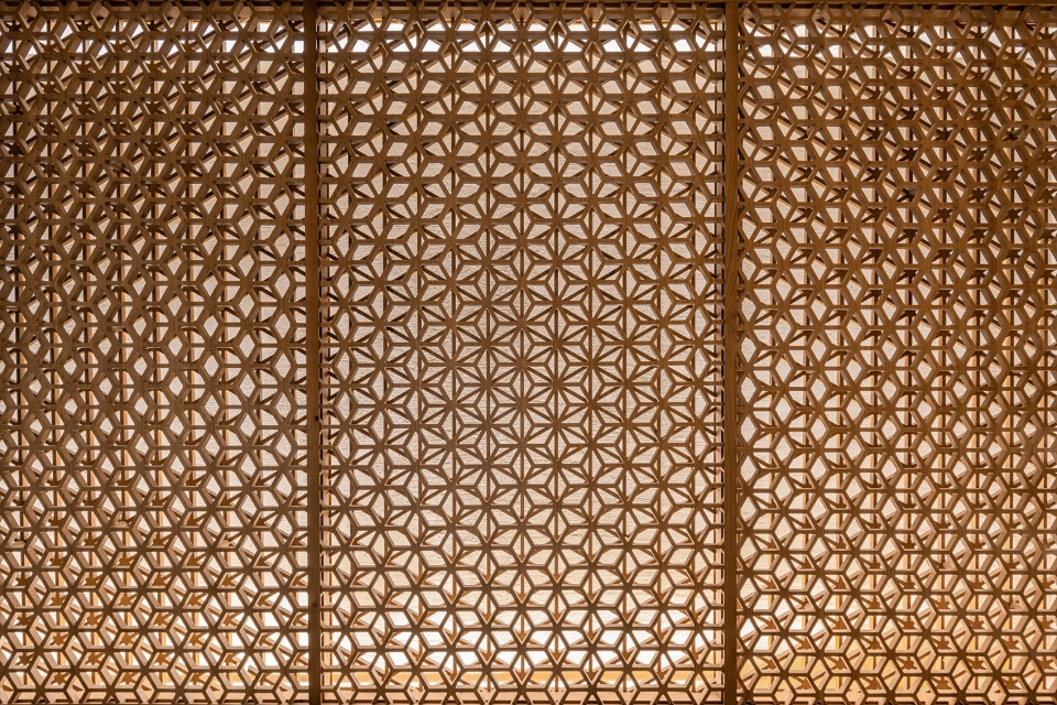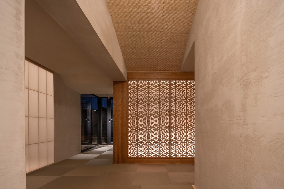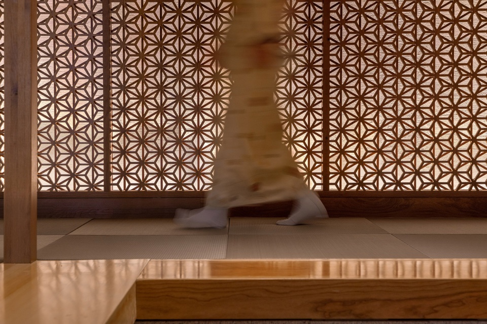 料亭的玄关位于天花板较低的二楼,因此玄关入口墙面的处理很重要为吸引客人的视线。我们将日本传统的麻叶图案解构为菱形和等边三角形,重组得到我们的双层格栅墙。我们从不同的角度能够得到不同的视觉效果,但从正面看的话麻叶图案依然是视觉中心。在鞋柜面板上我们加工了日本传统雕刻技术「名栗」。