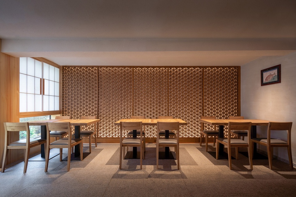 The entrance of restaurant is planned on the second floor where it has low ceiling height, so it is very important to design the walls as eye-catching ones. For the entrance wall, we disassembled the traditional ASANOHA pattern to two different geometric layers, one layer has diamond pattern and the another has the equilateral triangle pattern. In front of the wall we can recognize it as ASANOHA, but it gradually shifts toward the periphery. On the shoe box panels, they were carved by Japanese traditional technique called as NAGURI, and it had the beautiful shaded expression.
