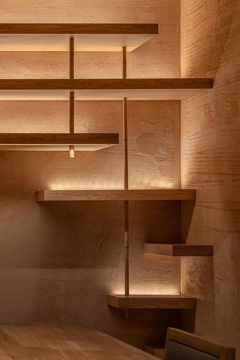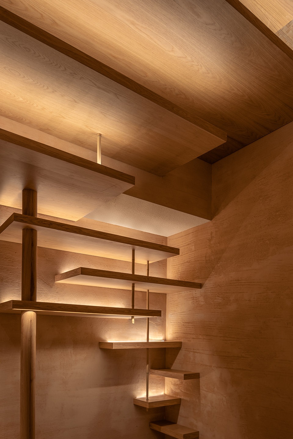 On the third floor, there planned VIP rooms of calm atmosphere. For using enough height of attic, we expanded the set of staggered shelves called as CHIGAI-DANA up to the ceiling, and put the indirect lighting on them. This technique is reference of KASUMI-DANA at SHUGAKUIN imperial villa in Kyoto.
