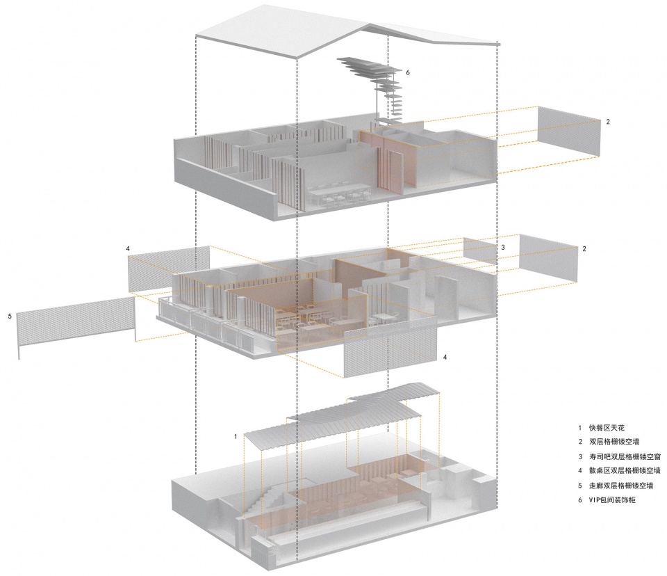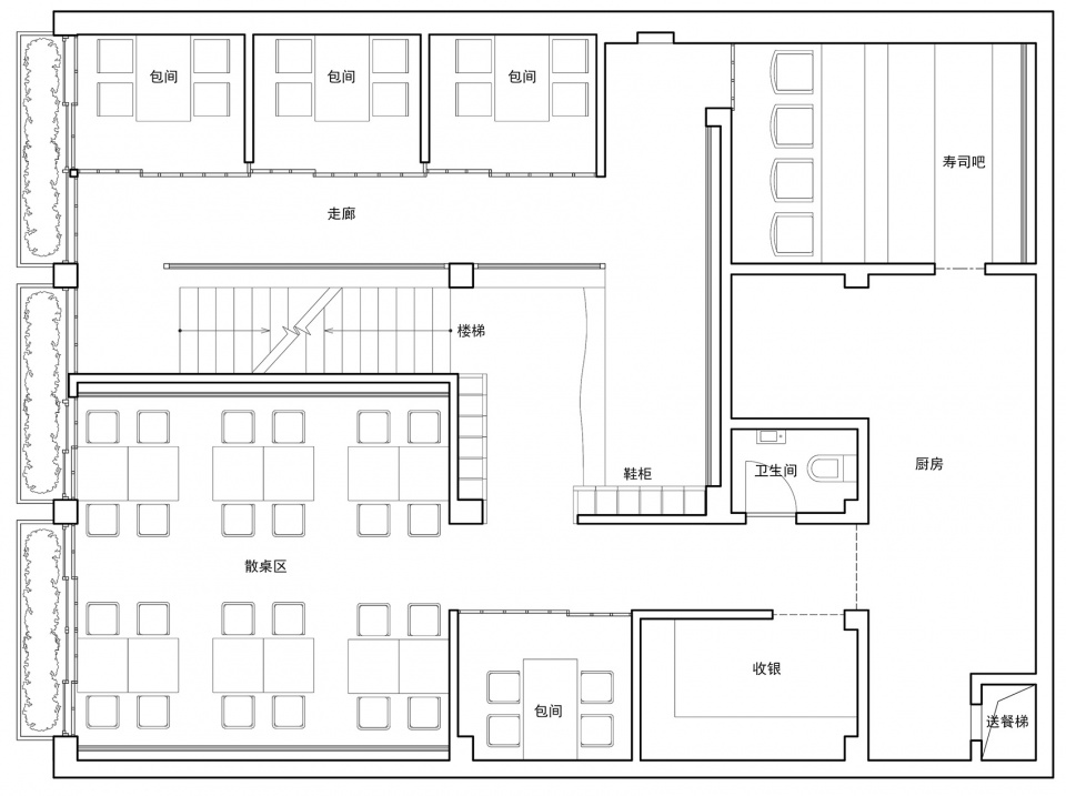 二层的一半区域由包间和寿司吧构成,我们采用了日本传统的太鼓张作为隔断,在保障私密性的同时又具有通透性。二层的另一半区域大厅,我们将木格栅墙元素运用在大厅的俩面墙上。为了确保日光的同时阻挡外面邻街杂乱的景色,我们将整个阳台种满了植物并用脚下开放的雪见障子作为隔断。