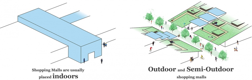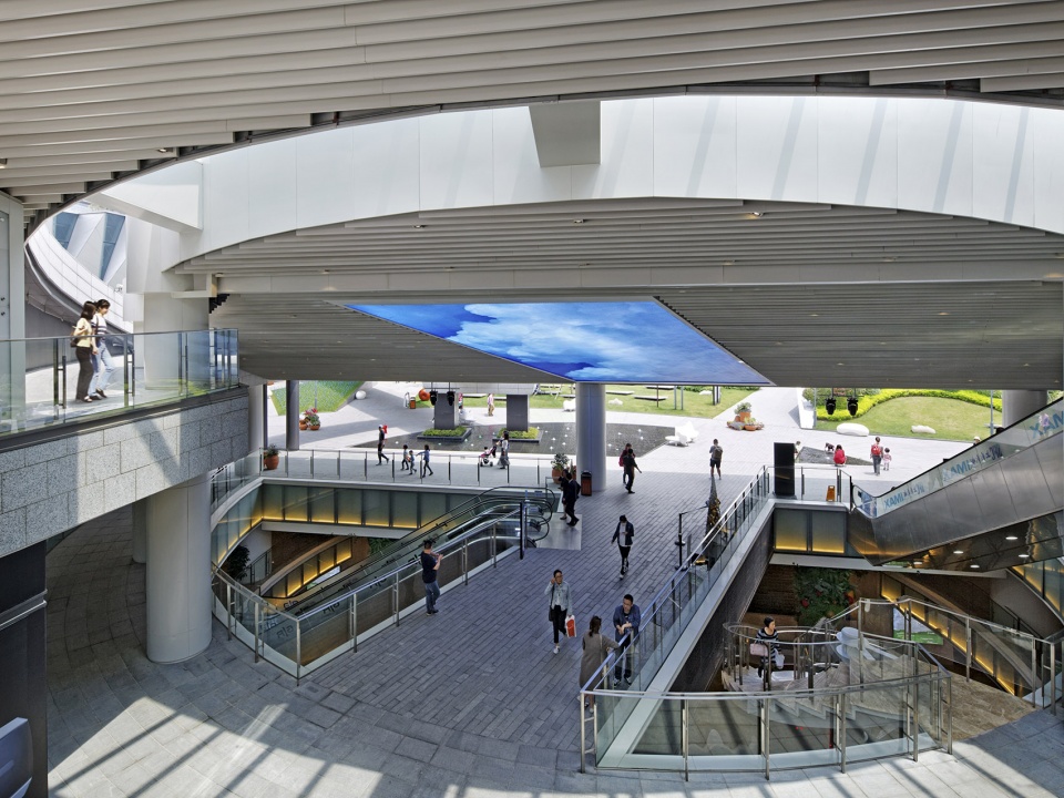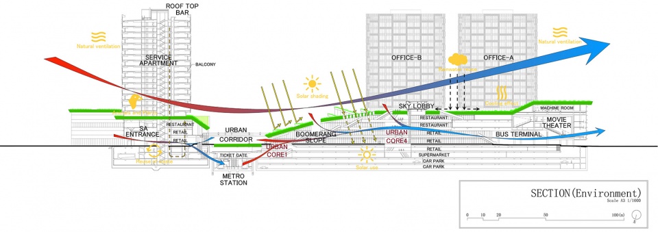 项目充分利用了环境技术,将所有的商业动线都安排在了无需空调的半室内半室外的灰空间内。通过此举,普通情况下每年需要112,000GJ的空调能耗在本项目中被削减为零。而且无空调的设计,有效降低了本项目每年二氧化碳的排放量约72,200吨,这相当于26.2公顷的森林一年能够吸收的二氧化碳的数量。