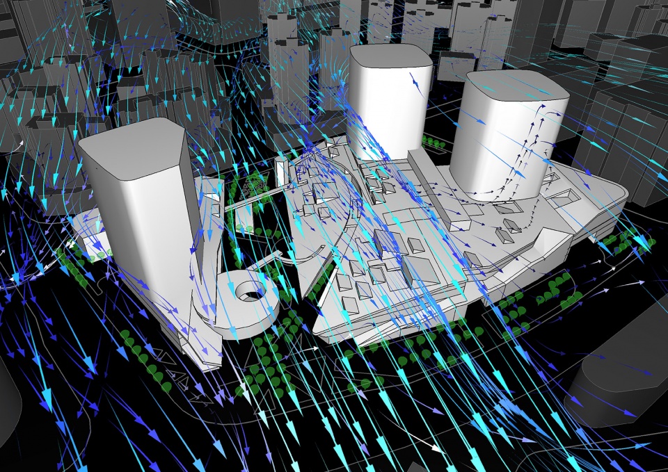 场地内设计了巨大的绿化空间。在这些绿色之中,设计师以上海传统建筑的“老虎窗”为灵感,在不同的建筑高度上设置了着大量的外向型小型活动平台;并且通过将所有这些尺度适宜的活动场地、 绿化屋顶、办公入口、零售店铺以及公共交通场地被紧密的编织在生动有趣的在三维空间之中,凝聚成为了一个大尺度的,拥有充足自然光和绿色元素城市公共空间。