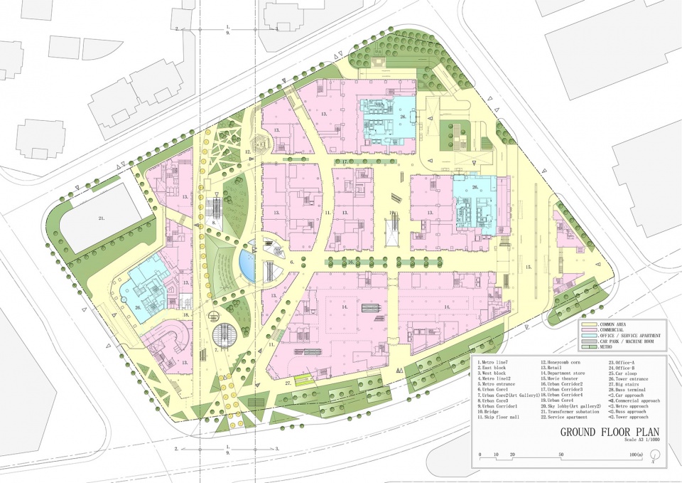 This is a valley-shaped architectural topography, floor area 300,000㎡, with a very broad green pathway designed at the center of the site. It is located right above one of the core metro station Long Hua Lu, where metro Line 7 and Line 12 come across each other. It is an advanced Transit Oriented Development of the city, which attracts most of the population coming to visit who are using the station daily as well as the surrounding city dwellers.