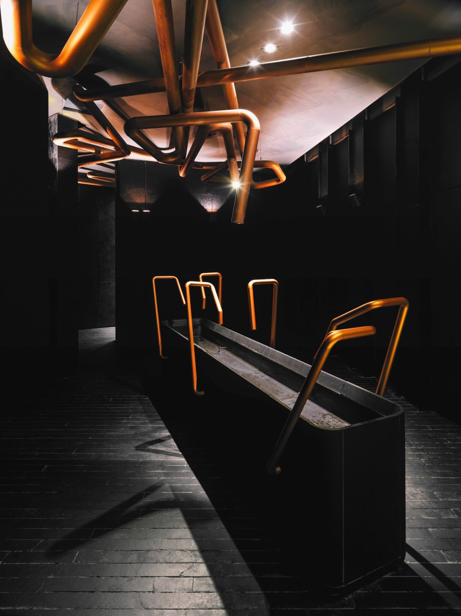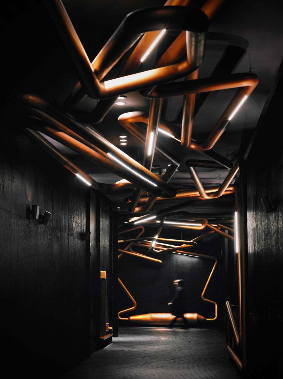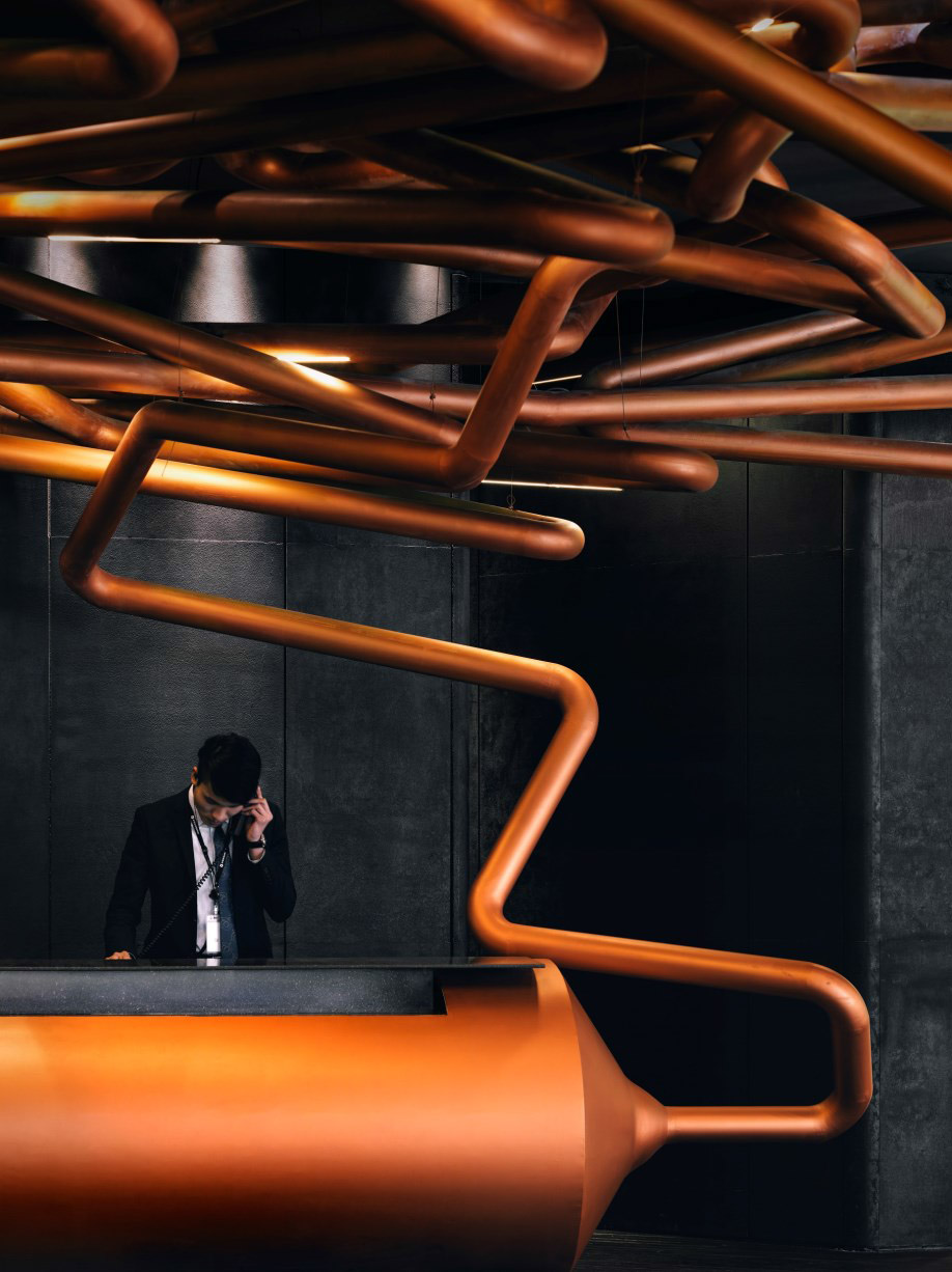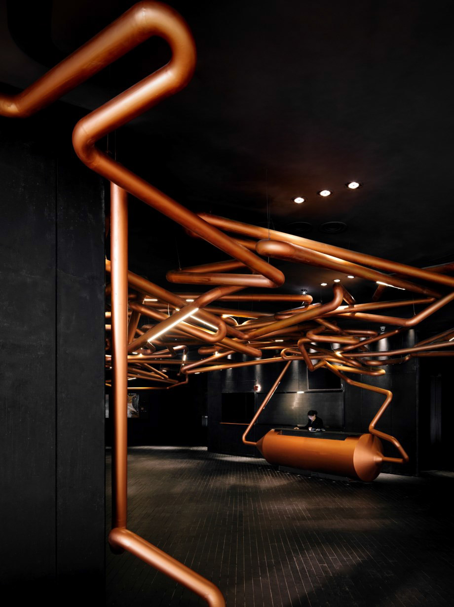 走进大堂,你会看到整个天花都是这些呈古铜色的圆管,有的垂到地面变成座椅给客人休息,有的变粗、变宽成为票务处的柜檯。这些笔直的圆管在不同的位置突然屈曲成大大小小的角度,抽象地模仿路轨的形态。圆管上安装了长条形的灯,这些发光的位置除了能点缀这些圆管装饰,也有照明的作用。这些圆管装饰其实是金属棒,经氟炭漆加工成饰面,跟黑色的烧面黑麻石牆身和地面形成鲜明的对比。