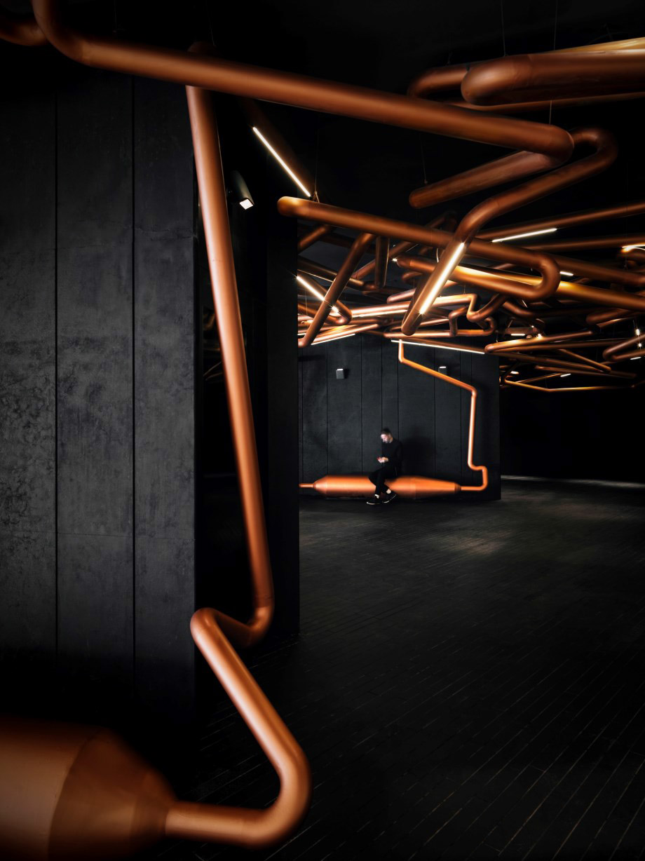 ▼影院一览,古铜色圆管穿梭于每个角落,over all view of the cinema with copper colored metal tubes stretching throughout the entire space