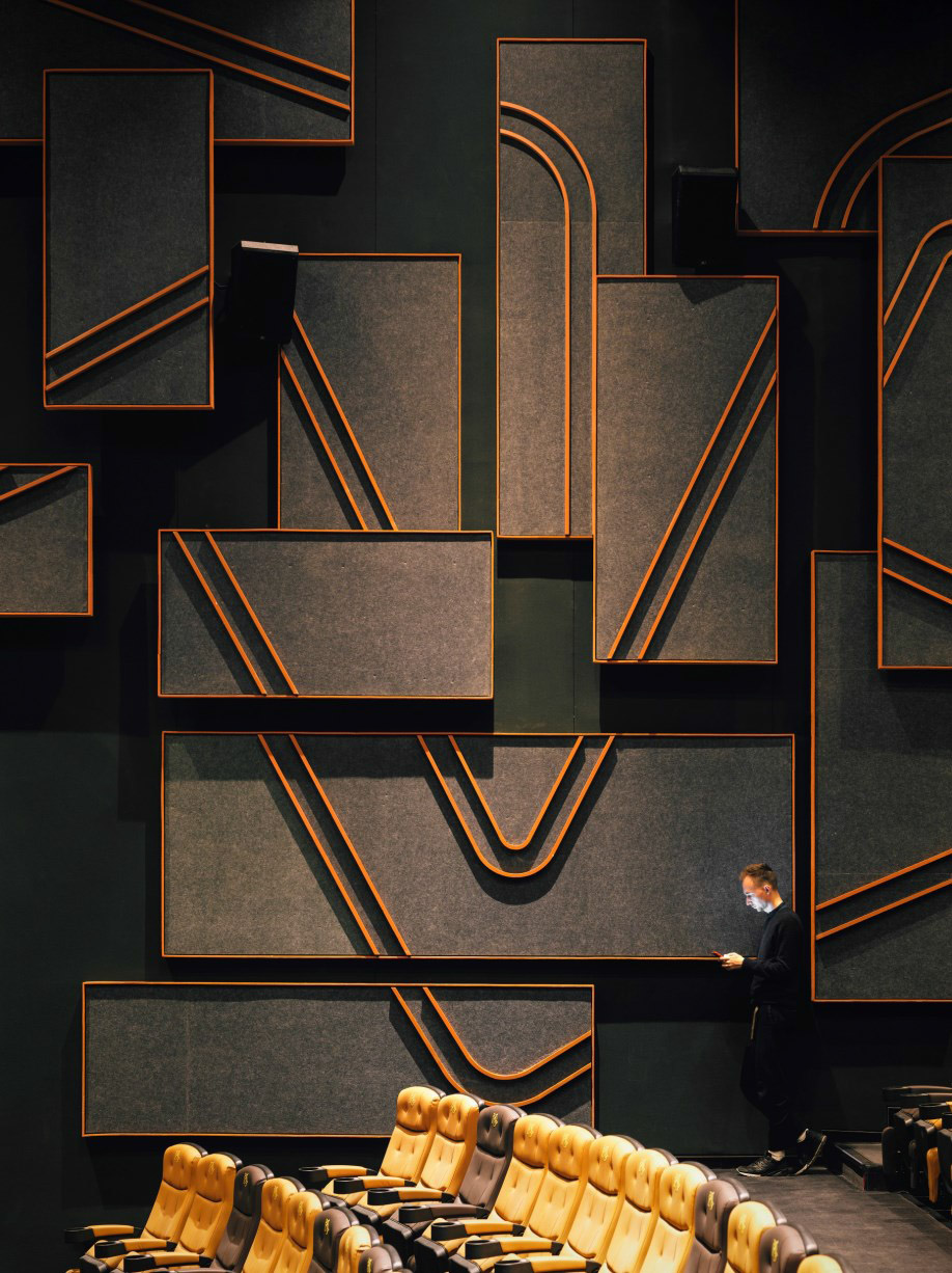 ▼普通影厅,墙面装饰有路轨图案的吸音板, normal auditorium with acoustic panels on the walls decorated with rail segments