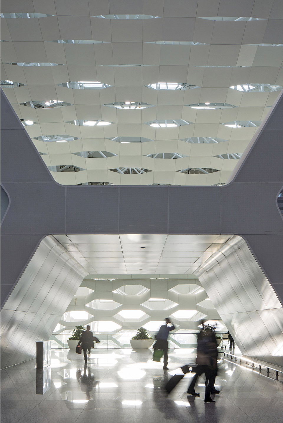 The interiors designed by Fuksas – placed in the internet-point, check-in, security-check, gates and passport-check areas – have a sober profile and a stainless steel finish that reflects and multiplies the honeycomb motif of the internal “skin”.