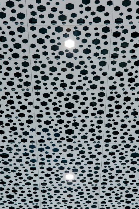 该项目的代表性元素是包裹住建筑结构的蜂窝状双层表皮。自然光线可以从其双层表皮结构中穿过,在建筑内部形成斑驳的光影效果。表皮的覆层由有六边形蜂巢状开口的金属,与不同规格的玻璃窗组成,其中部分可以根据需要开启。