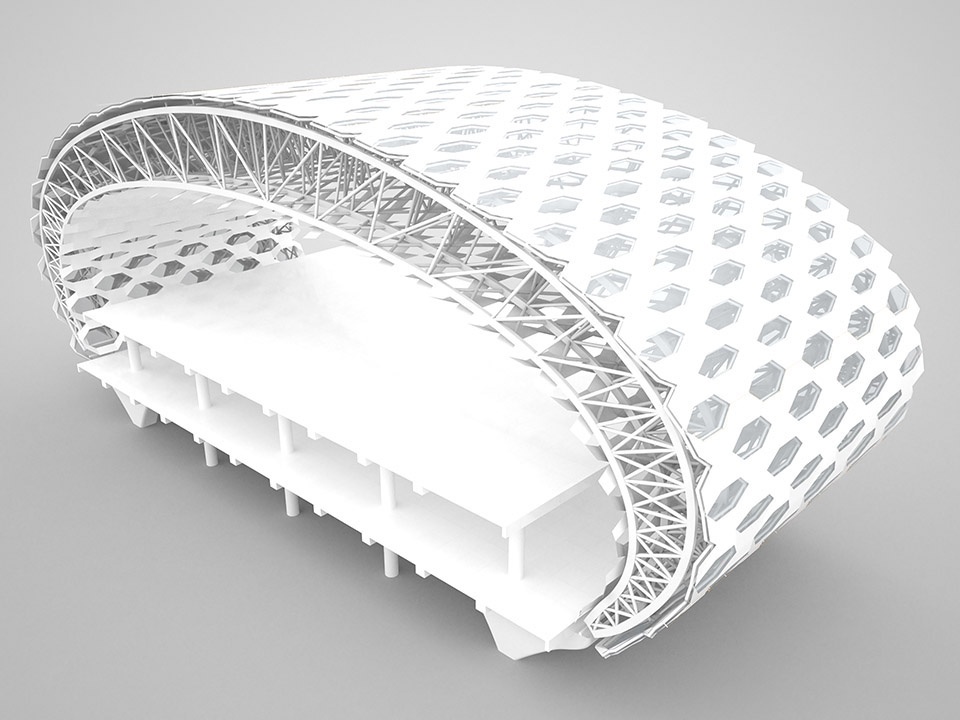 The symbolic element of the plan is the internal and external double “skin” honeycomb motif that wraps up the structure. Through its double-layering, the “skin” allows natural light in, thus creating light effects within the internal spaces. The cladding is made of alveolus-shaped metal and glass panels of different size that can be partially opened.