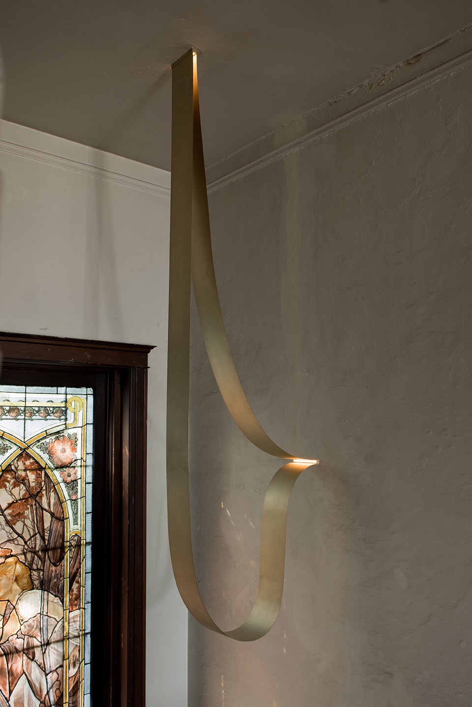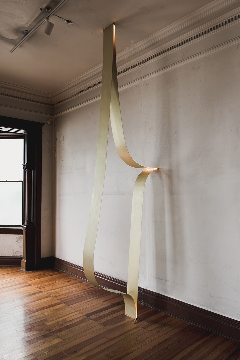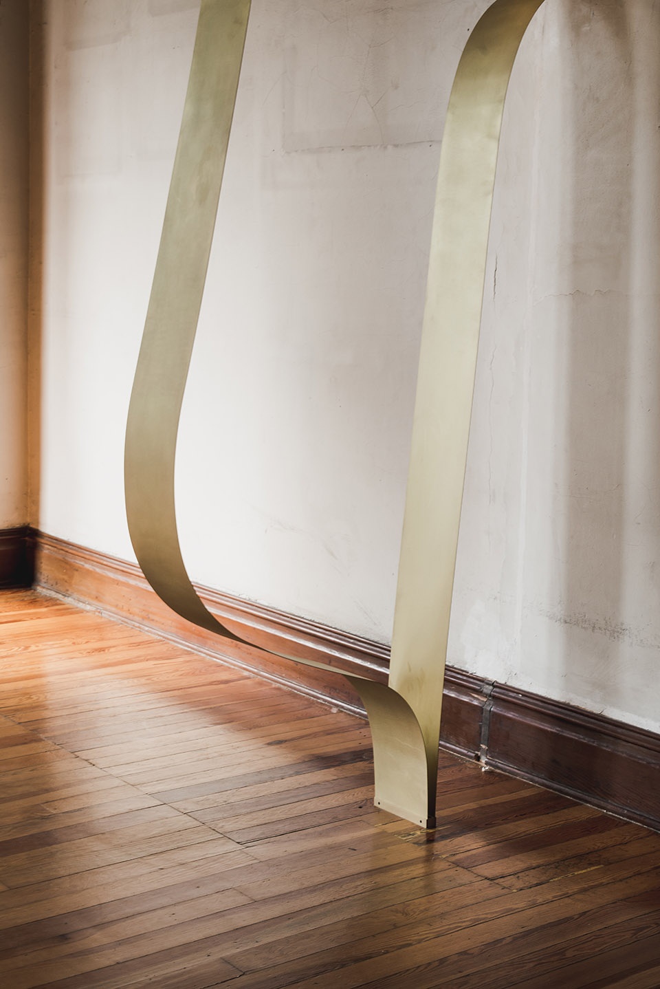 Collection of large-scale lighting sculptures that inhabit and are integrated into the space in which they are contained, in a relationship where the size of the piece creates a dialogue with the space intervened. Built from brass sheets shaped mostly by the weight and flexibility of the material and the tension generated by the position between the lighting fixtures and the wall/floor or ceiling. The resulting geometry is inhabited from within by light, creating a set of contrasts between the light contained inside and the space outside.