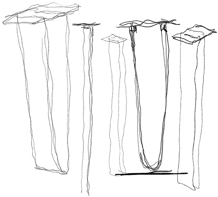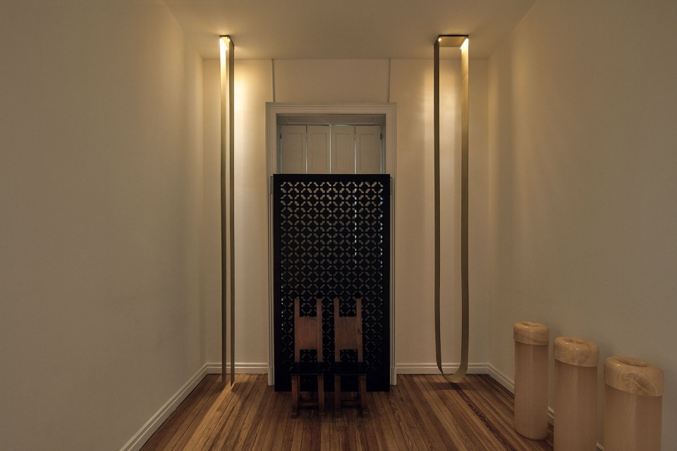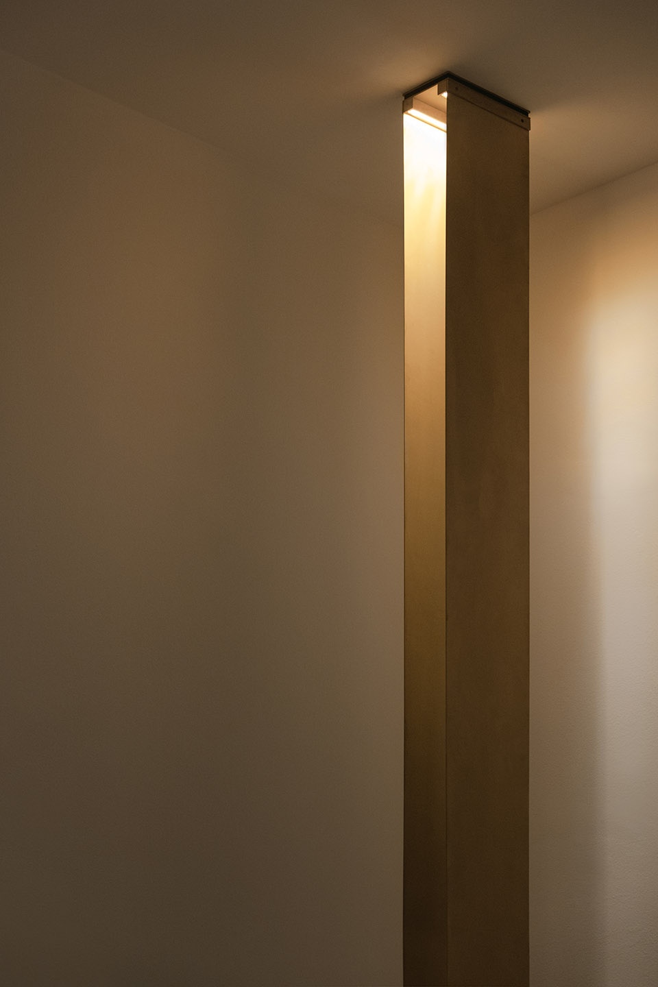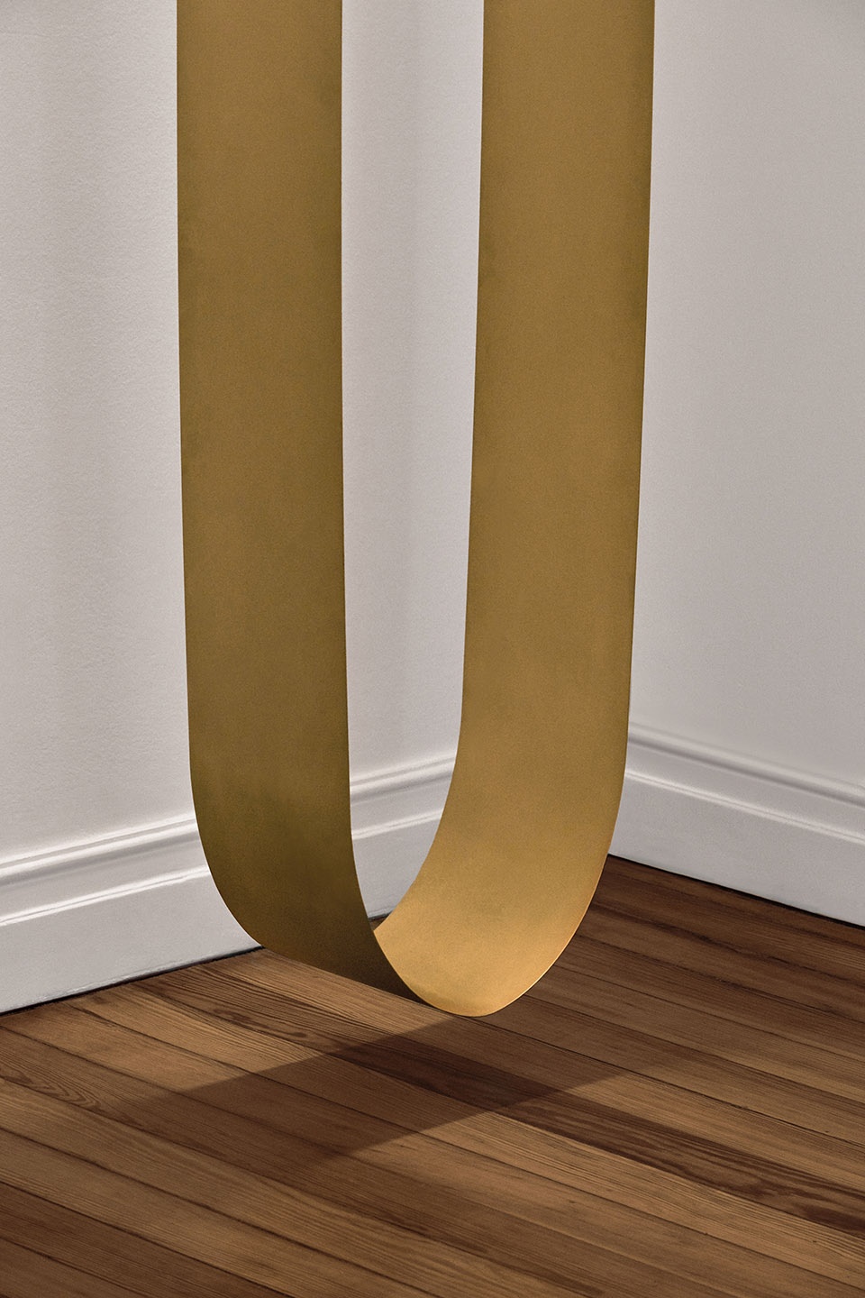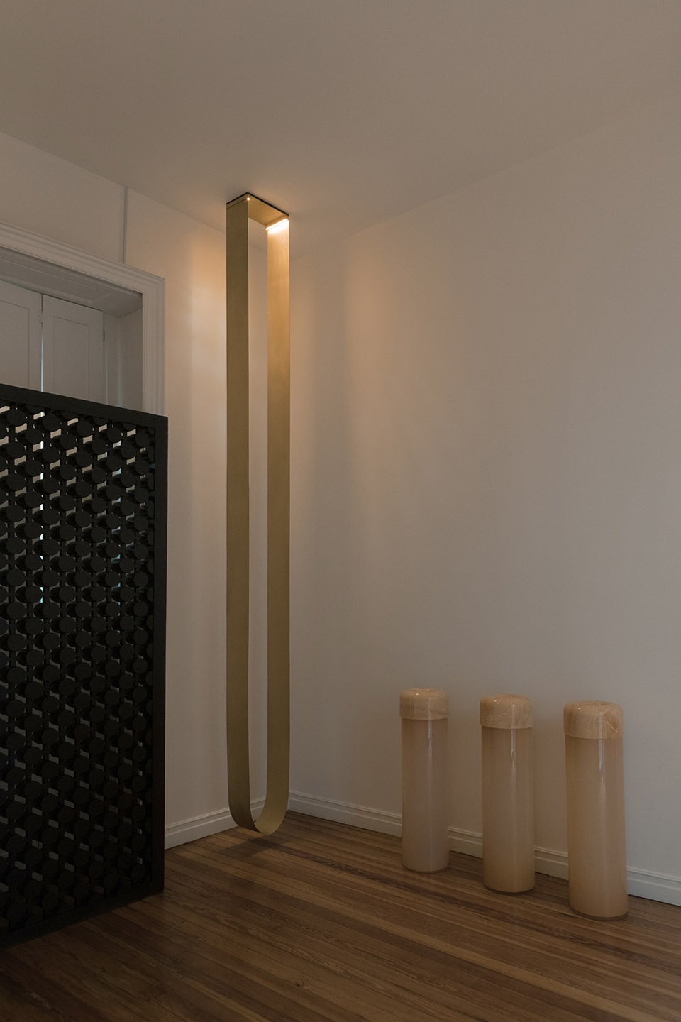 Collection of large-scale lighting sculptures that inhabit and are integrated into the space in which they are contained, in a relationship where the size of the piece creates a dialogue with the space intervened. Built from brass sheets shaped mostly by the weight and flexibility of the material and the tension generated by the position between the lighting fixtures and the wall/floor or ceiling. The resulting geometry is inhabited from within by light, creating a set of contrasts between the light contained inside and the space outside.