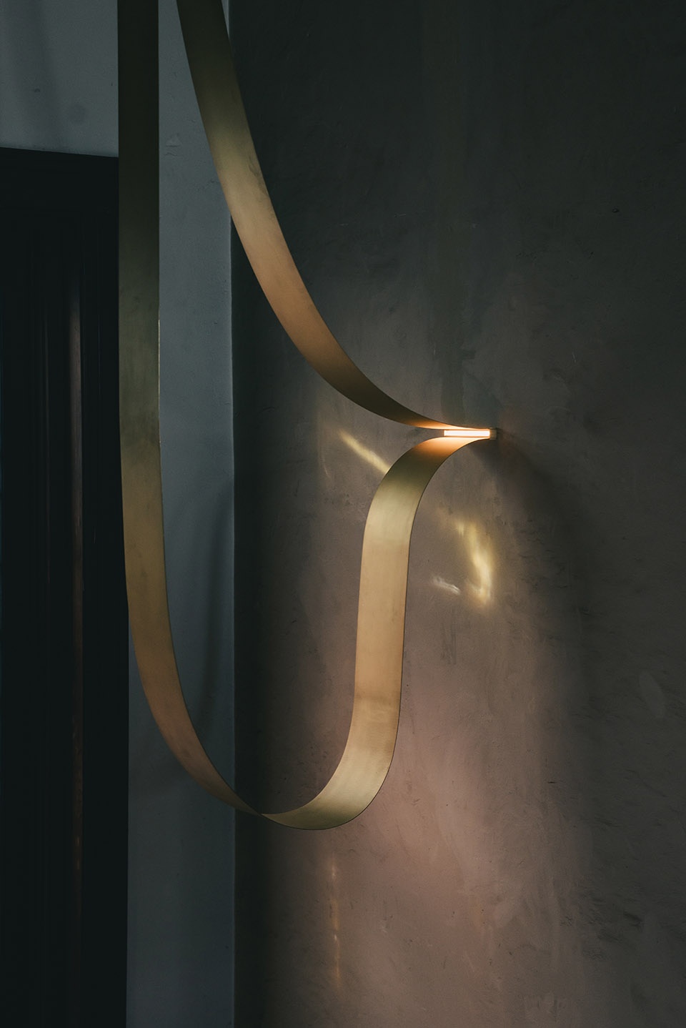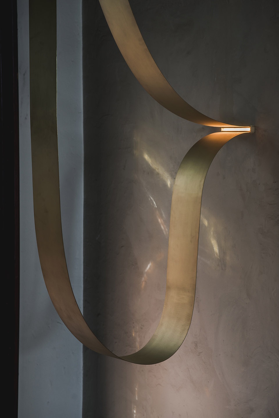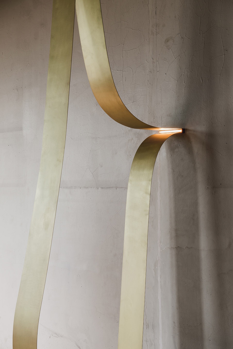 “抛物线”系列灯具能够以其雕塑般的形体“栖居”在空间内部并与之发生对话。该系列灯具由黄铜板制成,材料的重量感和柔韧性在灯具与墙壁/地面和天花板之间建立起一种充满张力的关系。灯具的独特形态被其内部的光线所充盈,在内部与外部之间创造出几组不同的对比。