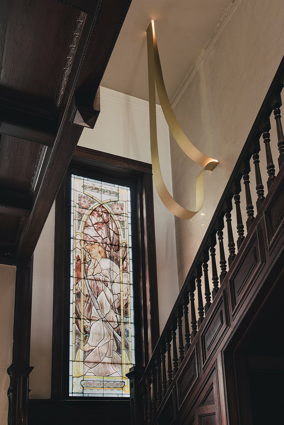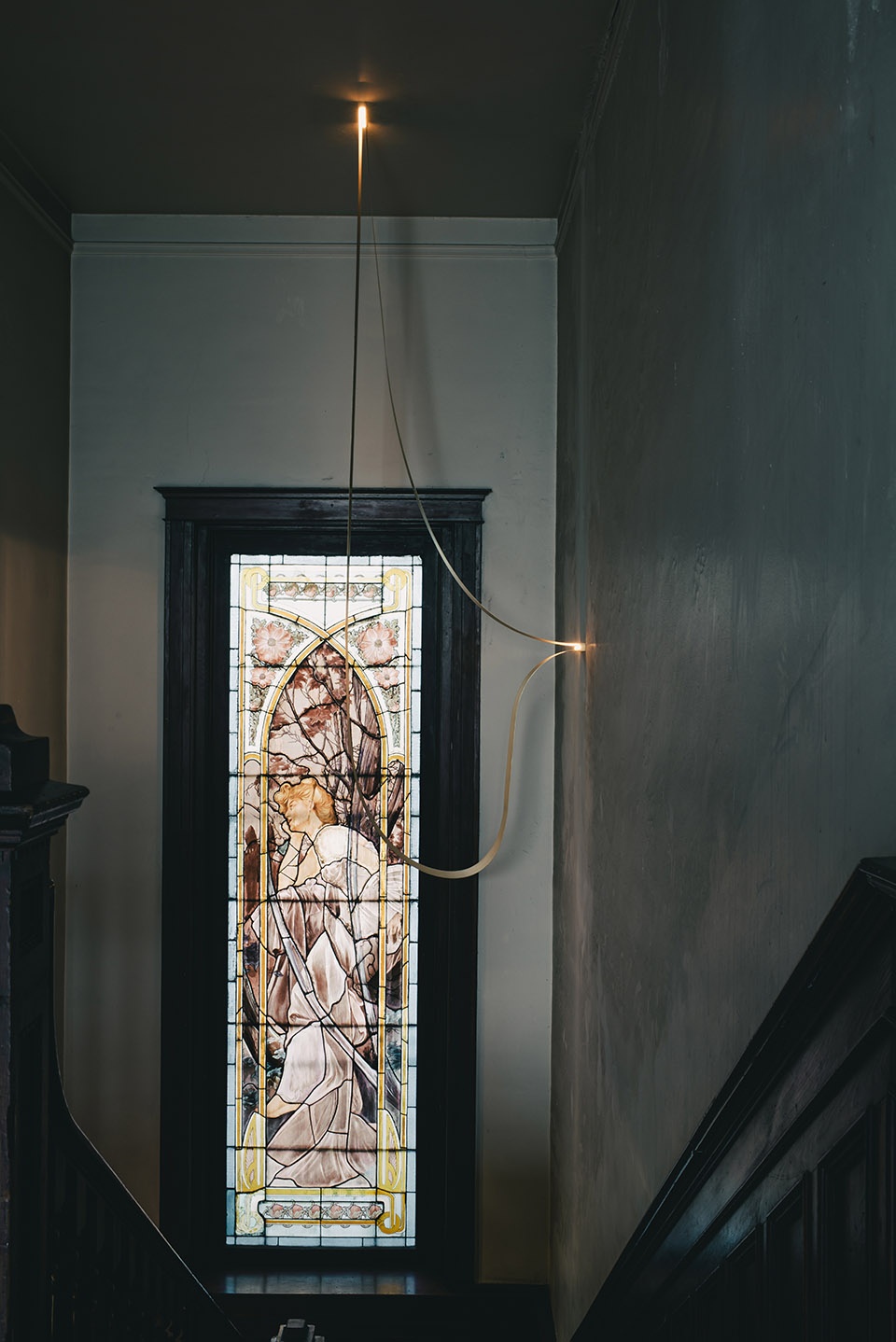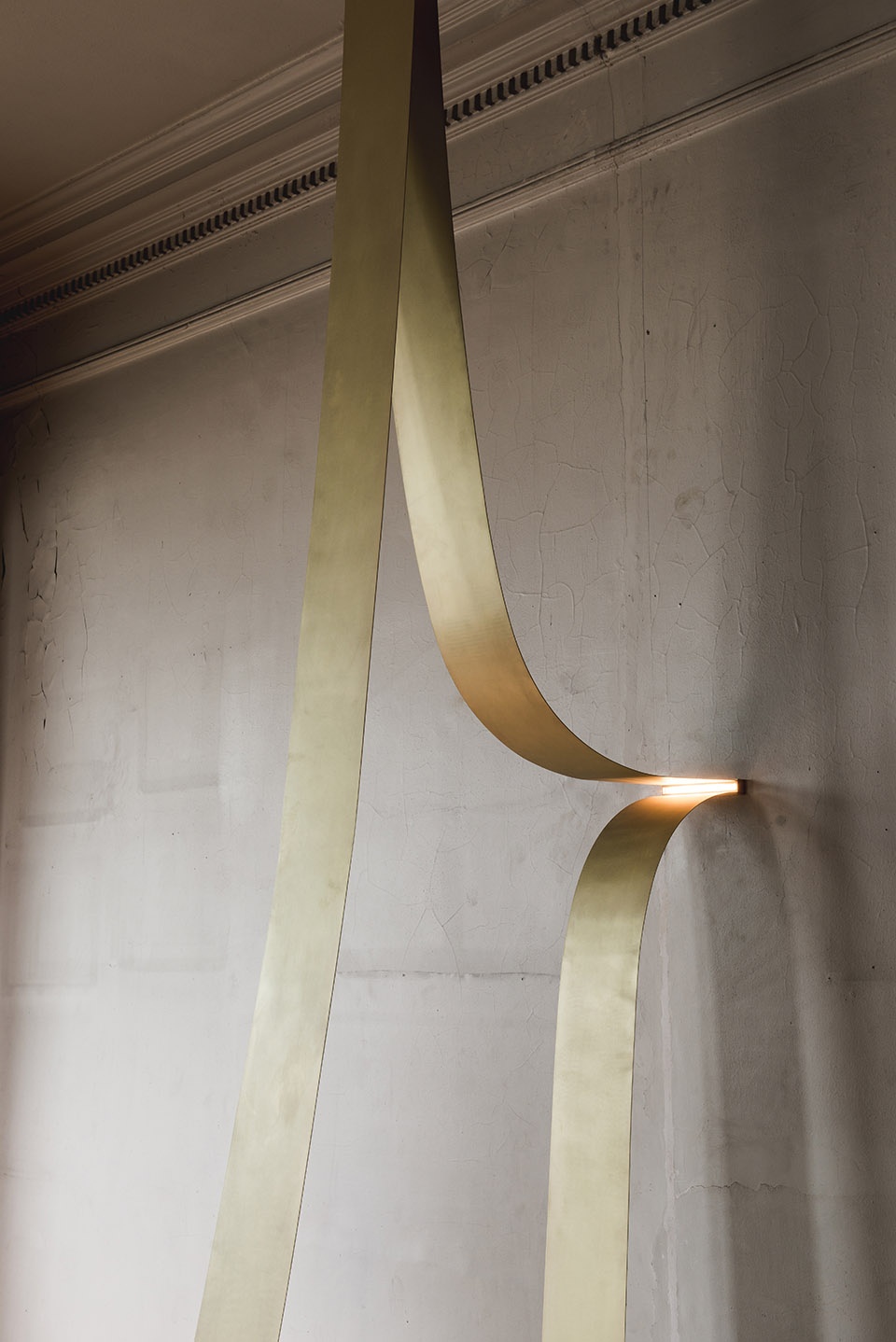 “抛物线”系列灯具能够以其雕塑般的形体“栖居”在空间内部并与之发生对话。该系列灯具由黄铜板制成,材料的重量感和柔韧性在灯具与墙壁/地面和天花板之间建立起一种充满张力的关系。灯具的独特形态被其内部的光线所充盈,在内部与外部之间创造出几组不同的对比。