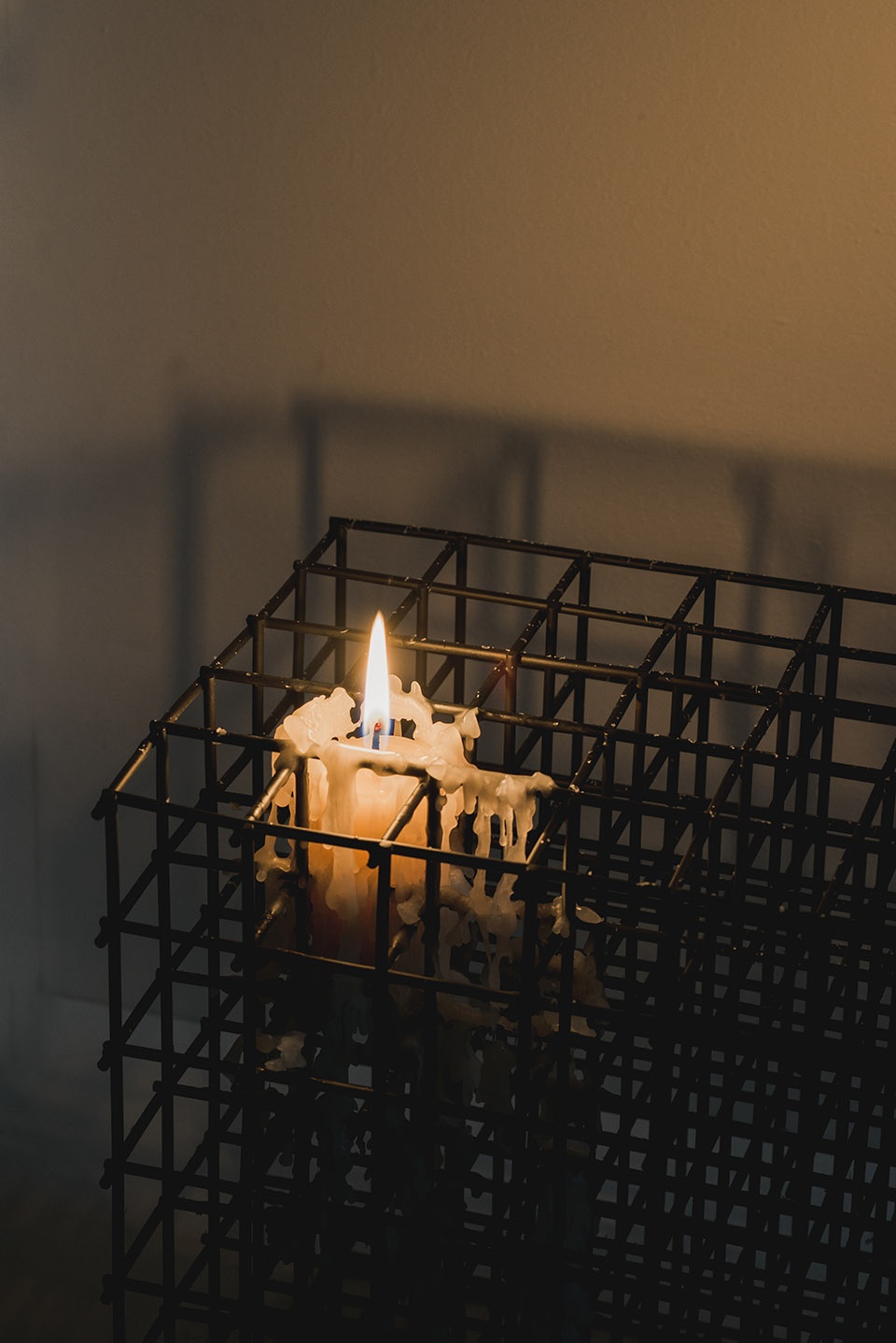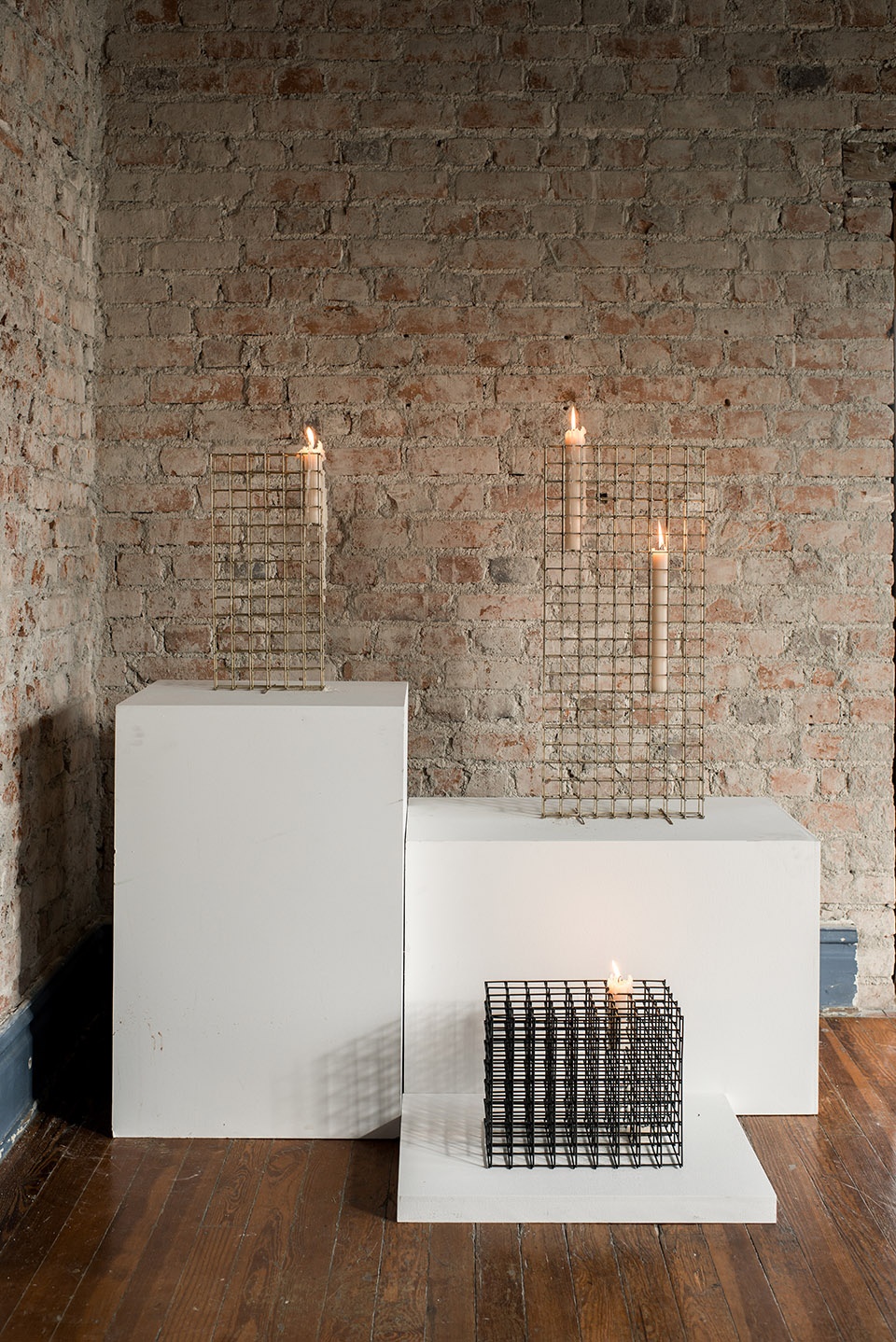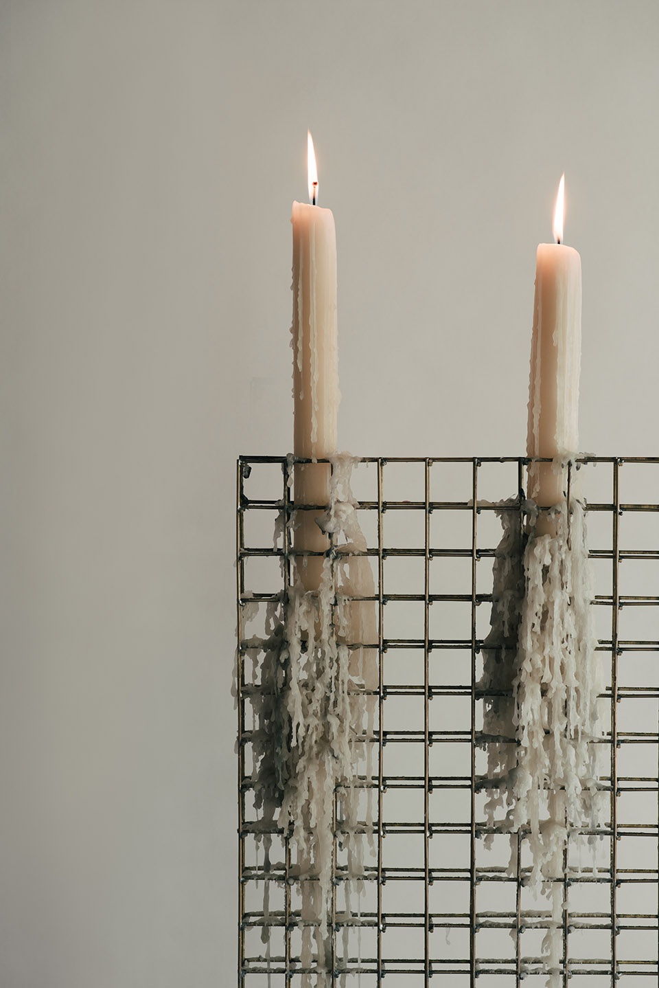 A series of architectural and sculptural structures in diverse formats and proportions, built from a continuous metal grid (brass or iron), in which each element offers the possibility to hold one or more candles. As the wax melts, it fills the metal lattice forming an organic, random and dramatic expression that builds up over time and accumulates into an ephemeral presence, creating a living changing piece that evolves and transforms.