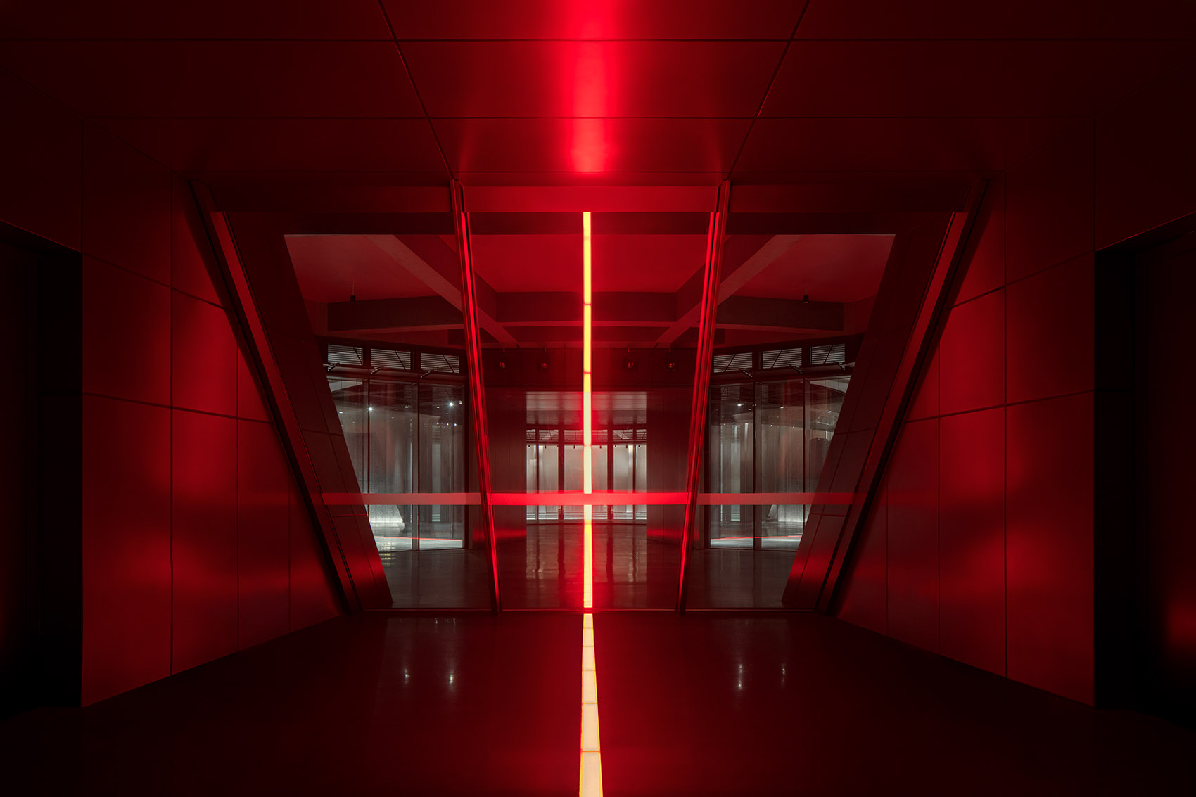 从“生命之火”指向高炉方向,设计导入了第三组空间装置——“首钢功勋柱和铁水光带”。铁水光带从水院出发,火红的灯光劈开地面一路奔涌流淌向东,抵达红色穿孔板包裹的功勋柱,柱内LED环幕上以滚动呈现的首钢员工花名册向每一位用双手塑造了企业辉煌的个体表达深沉的敬意。