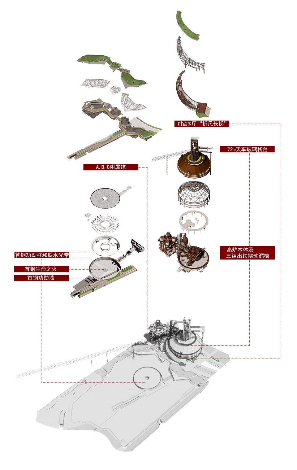 设计核心策略为“封存旧、拆除余、织补新”。即留下工业遗存最醇厚的历史记忆;适当移除不必要的工业建筑,建构高炉和自然间的有效对话;为项目注入崭新的城市功能和梦想。