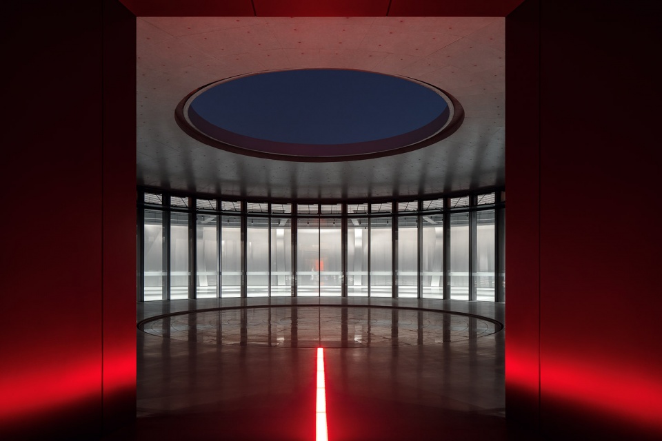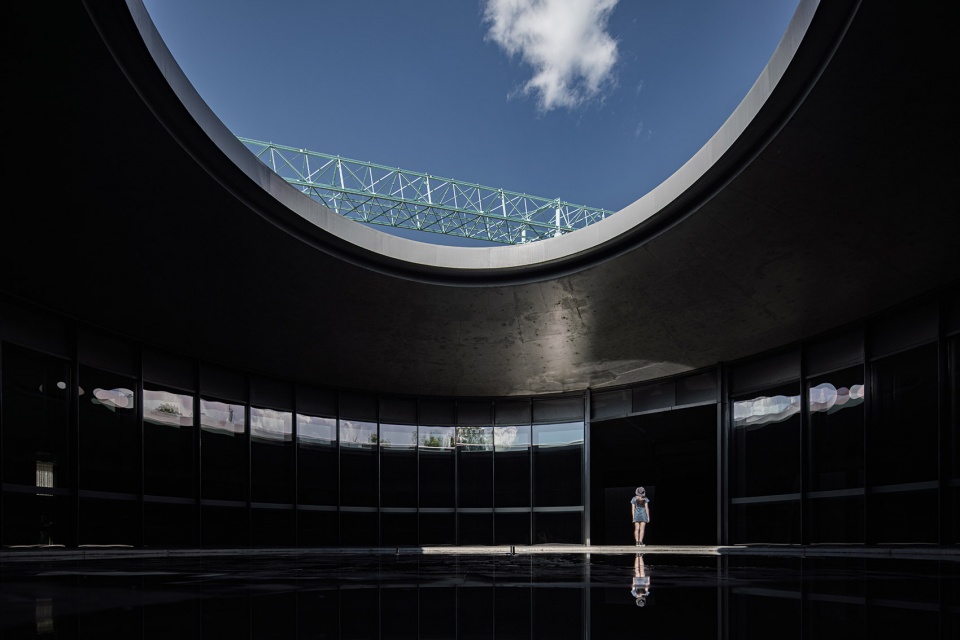 ▼圆形的天井位于水下展厅的中心,隔空仰望,高炉正被纳入圆形框景之内,the circular patio at the center of the underground exhibition hall ©筑境设计