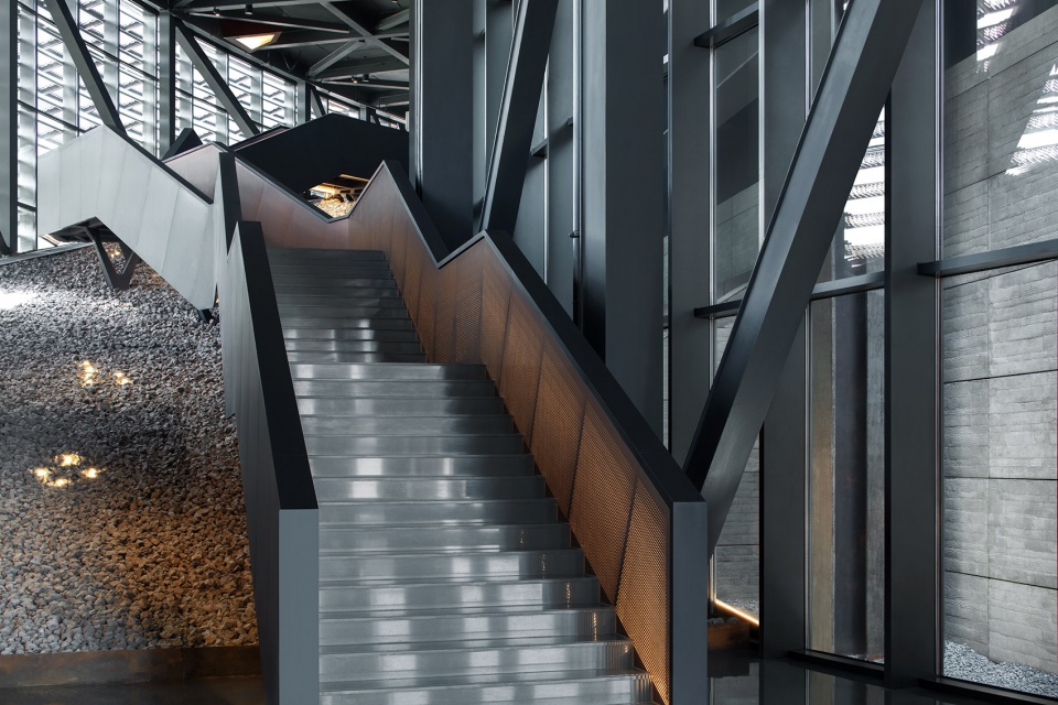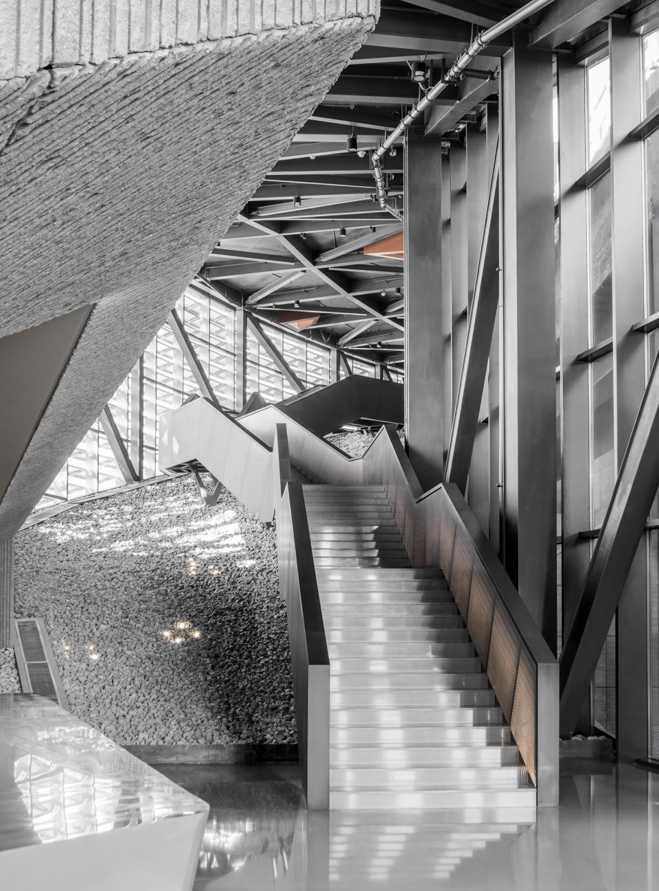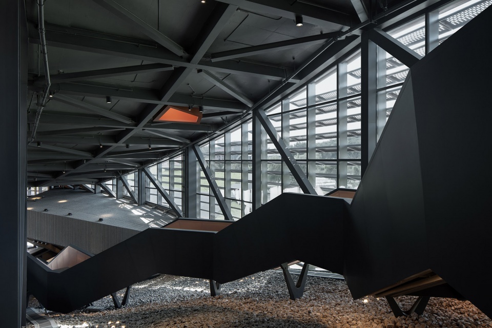 The Folding Rule Staircase in D hall is the fourth group. A long dragon-like staircase is attached to the giant cavity steel truss on the west side of the Furnace, which winds from the main hall to the main exhibition hall, to guide visitors. The floor under the staircase is paved with ironstone and grain slag, combined with truss and half-space, which resembles mine and roadway. Long and circular perforated shading panels with holes of different sizes filter day lighting into the half-space, which expands the spatial distance while giving visitors more expectations of climbing higher.