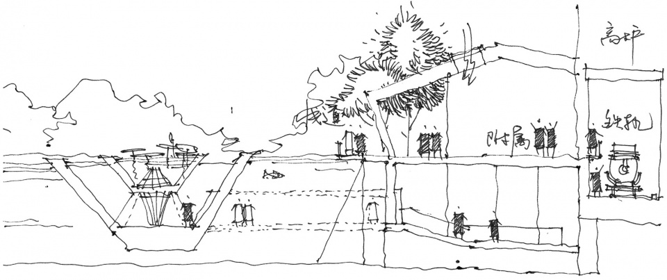▼秀池地下车库及水下展厅设计研究草稿,underground garage and exhibition hall analyzing sketch ©筑境设计