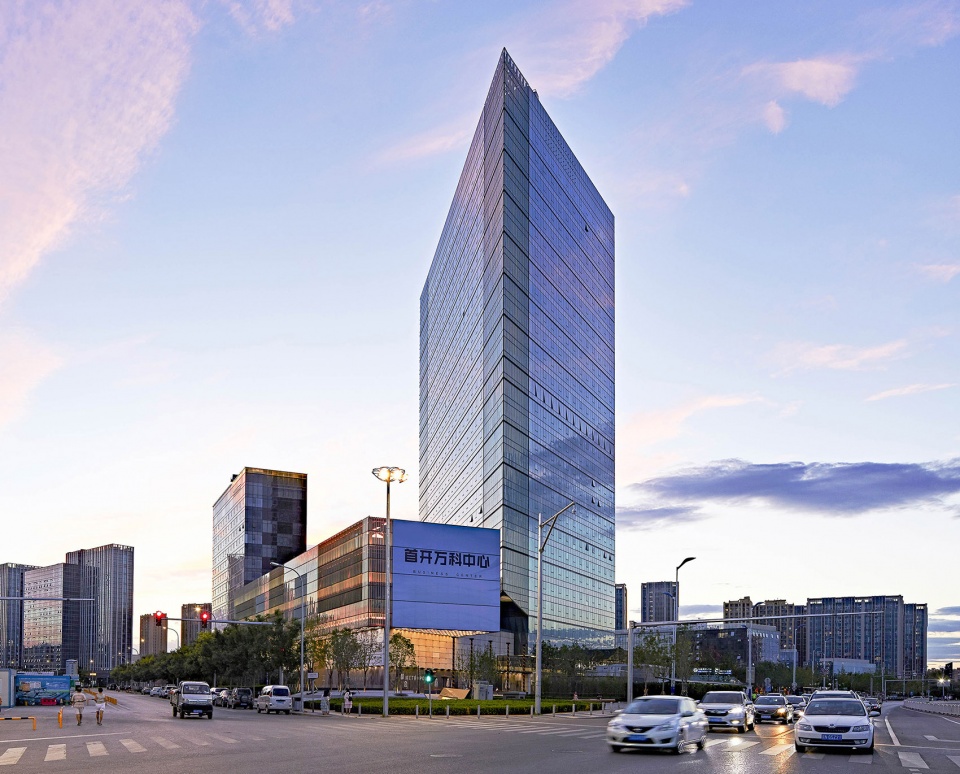 首开万科中心是一座总建筑面积132,000平方米的综合体,由一系列各具特点的单体建筑构成:一座124米高,建筑面积54,000平方米的办公塔楼;一个建筑面积26,000平方米的购物中心;以及一个酒店。