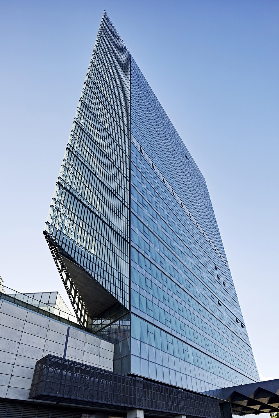 The office tower has a triangular shape which creates a strong presence at the main intersection yet appears elegant and slim from other points. The triangular shape is the result of a series of pragmatic decisions which include maximising views towards the newly built park and integrating double height sky-garden balconies into the tips of the floorplates. Their terraces provide comfortable outdoor seating areas with spectacular views over the adjacent park.