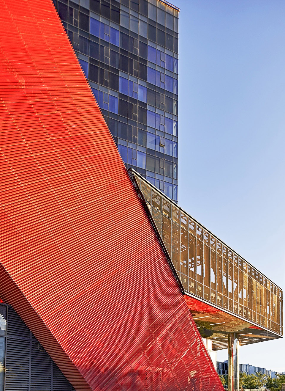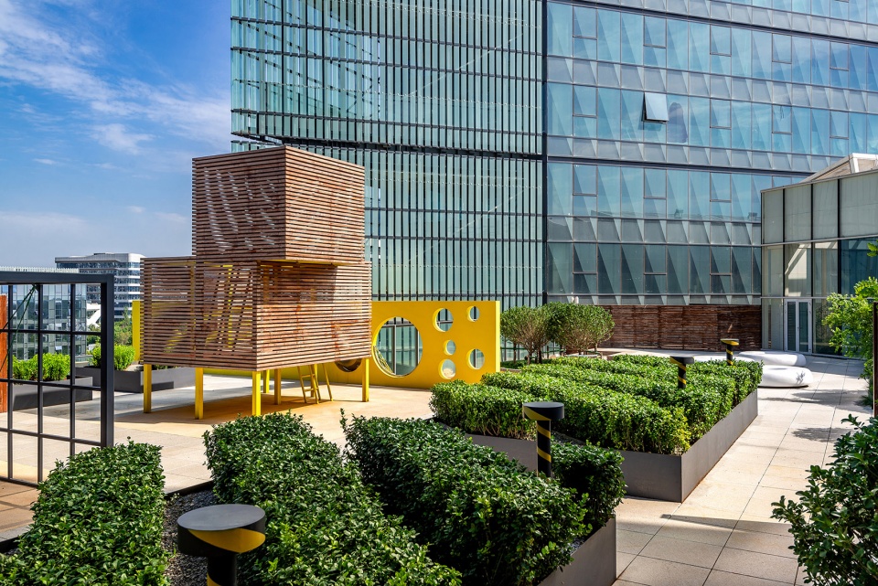The sky gardens balconies in the office towers across two floors providing a comfortable outdoor seating area with spectacular views over the adjacent park. While the design of the rooftop garden employs bright colours, lively forms and landscape by BAM to engage visitors and promotes opportunities for physical activities and playfulness.
