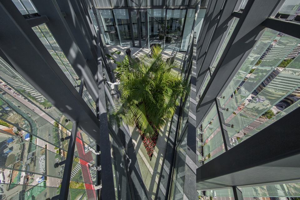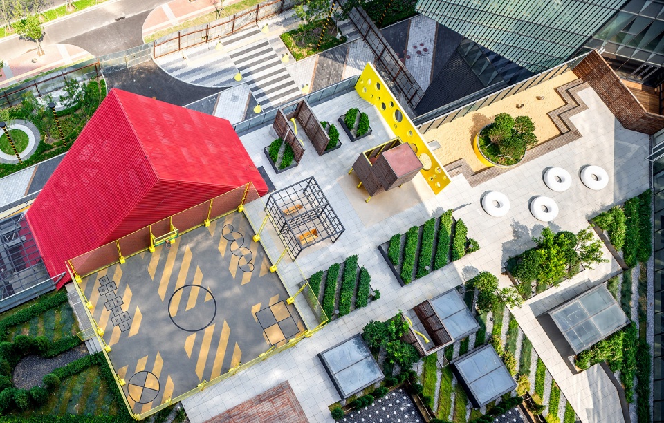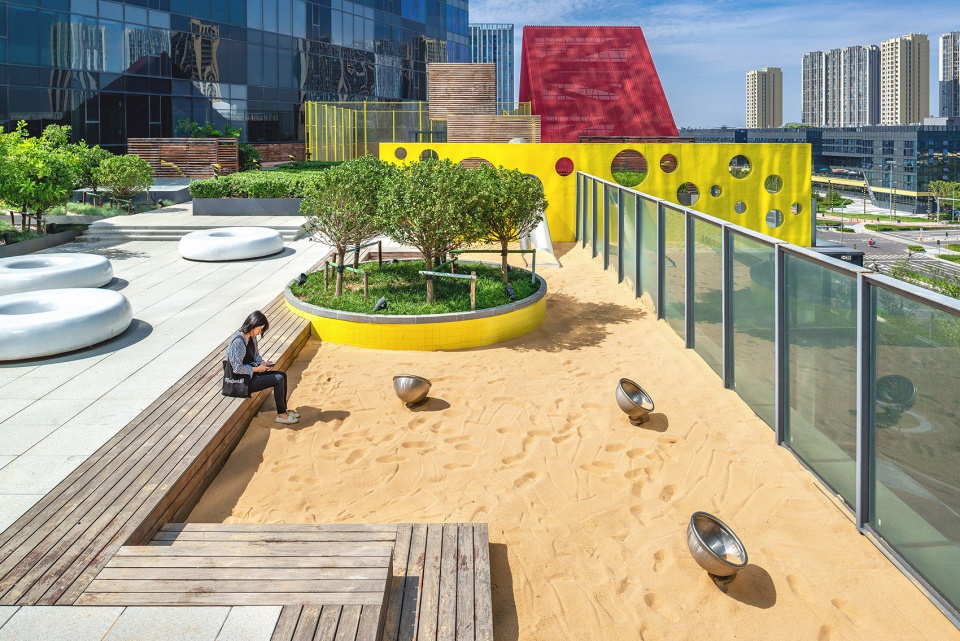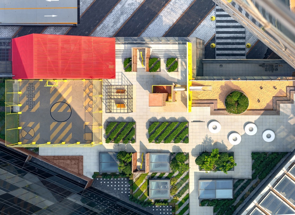 办公塔楼中两层高的空中花园阳台提供了舒适的室外休息区和极致的公园景观。而在中庭顶部创造的屋顶花园,联手BAM百安木进行景观设计,运用明亮的色彩、生动的形状和景观特色吸引人们的视线,为办公人群、商场用户及酒店入住的客人提供了户外社交的空间和运动玩耍的机会。