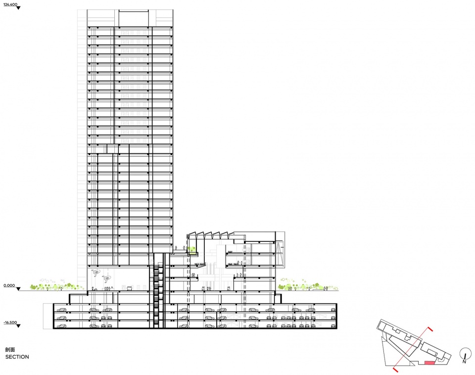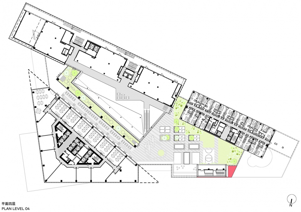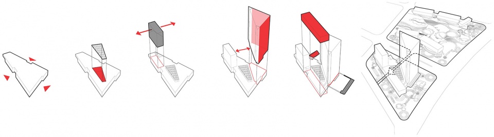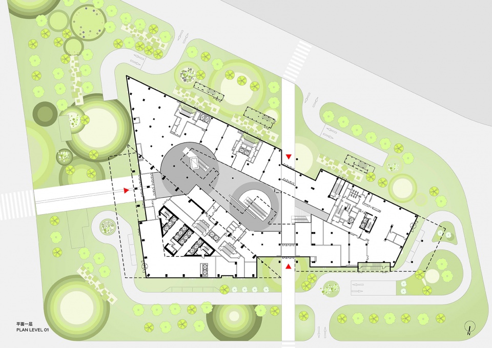 办公塔楼三角的形态在面向主路口的一侧创造了有力的形象存在,而在不同角度下又显得纤长、规律。塔楼的三角形态是一系列务实的判断结果,将办公楼面向新建公园一面的景观视角最大化,同时结合尖角部位打造两层通高的高空观景台。俯瞰临近公园的平台提供了可以一览美景的舒适休息区。