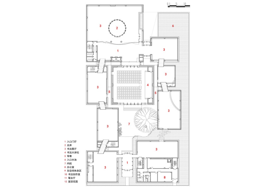 大小不一的体量内均是不同主题的书法展厅,所有的展厅均为大开间的无柱空间,可根据展览需要自由布展。展厅与展厅之间通过玻璃连廊相通,以利于连续观展。红砖展厅中部以贯通三层的光井,营造明亮通透的室内空间。