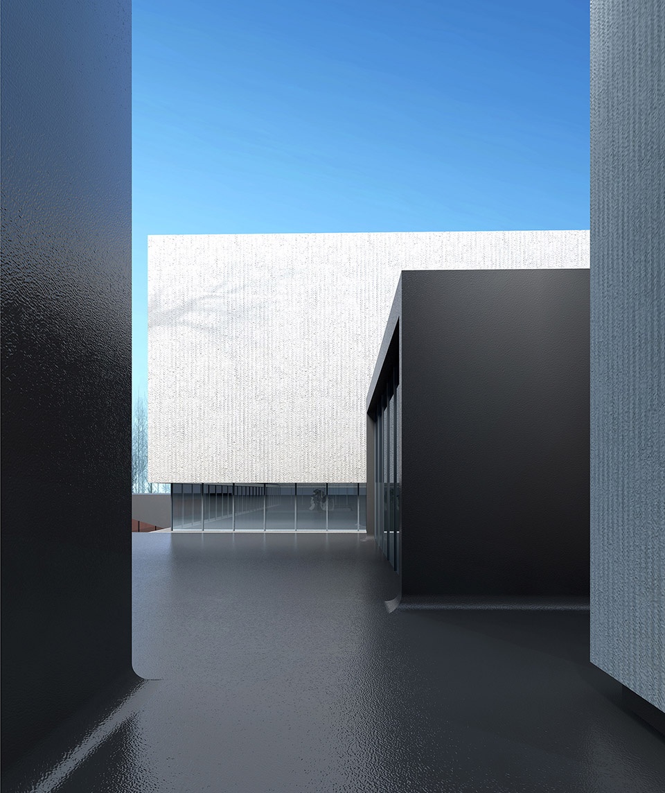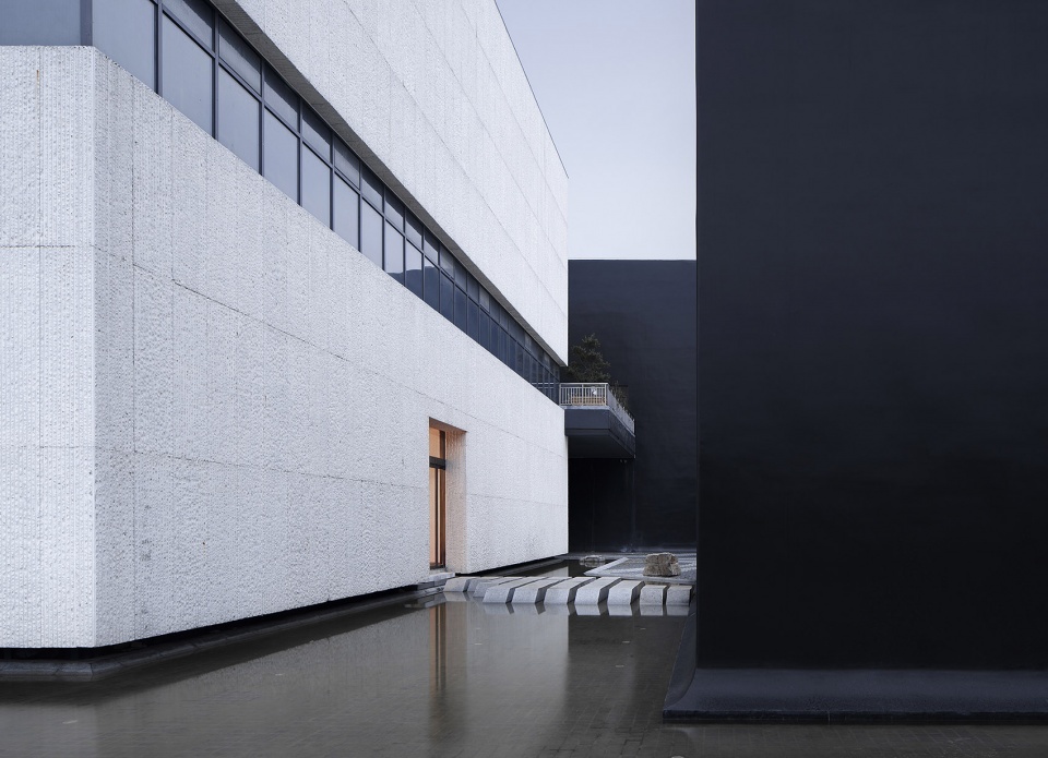 墨色体量角部均施以削切,以深灰色氟碳漆喷涂,在蓝天反射下墙面呈现出微妙的色泽变化,如巨石,如墨块,展现雄浑拙朴的质感。体量底部均做圆角处理,以扎根于土地的姿态体现书法艺术中的凝重感。白色体量选用预制混凝土挂板,表面均做竖向凿毛处理,如宣纸,如素绢,与光洁细腻的墨色体量表面形成对比,相映成趣。体量底部均凌空悬挑,呈现出漂浮的状态,体现书法艺术在精神层面的超脱感。