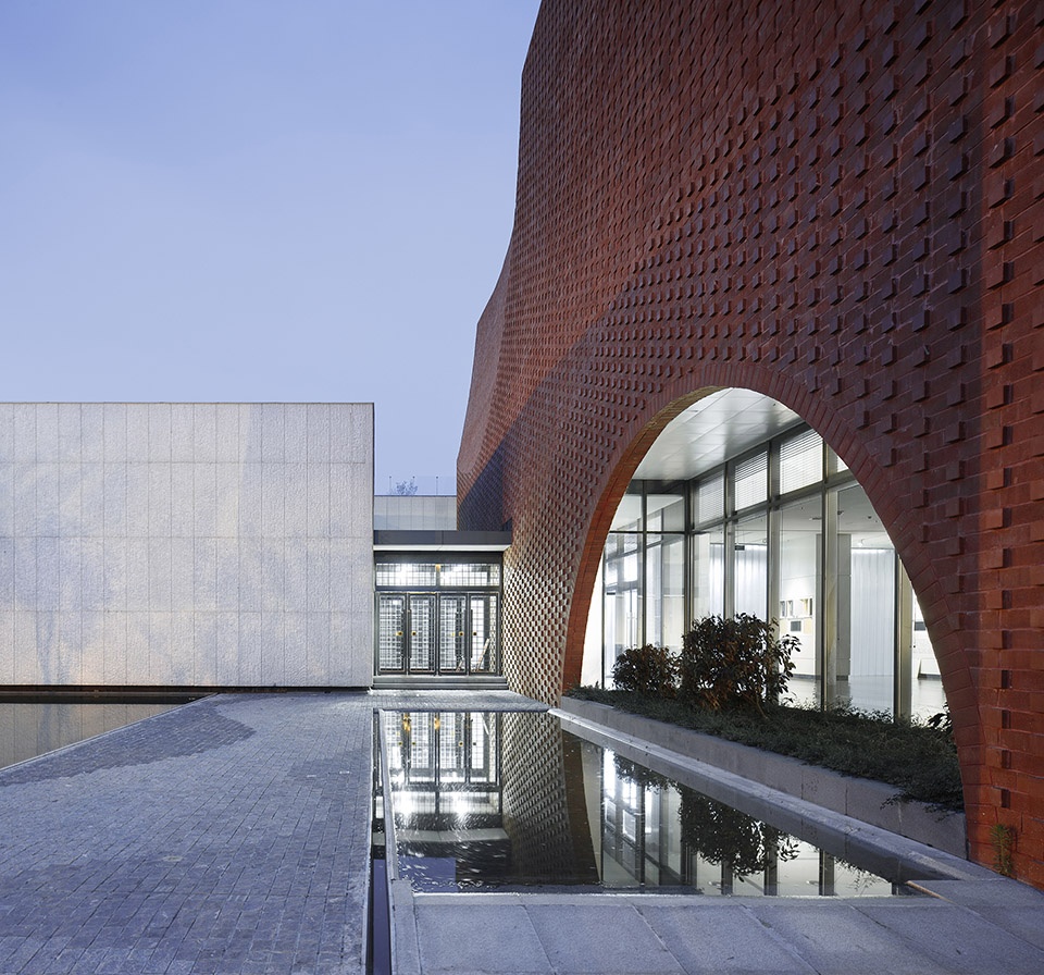 The largest exhibition hall along the street has the red-bricked exterior wall, like a condensed seal printed on the elegant scroll of ink and wash. The way of cutting the corner through the arc surface strengthens the iconic character of the building along the street, forming a unique lasting appeal. Red brick is Yixing clay brick, adopting three kinds of lining according to the different locations. The lower brick head outstand the wall, and the upper part intrudes the wall, and cut part is flatly lined, forming different textures.
