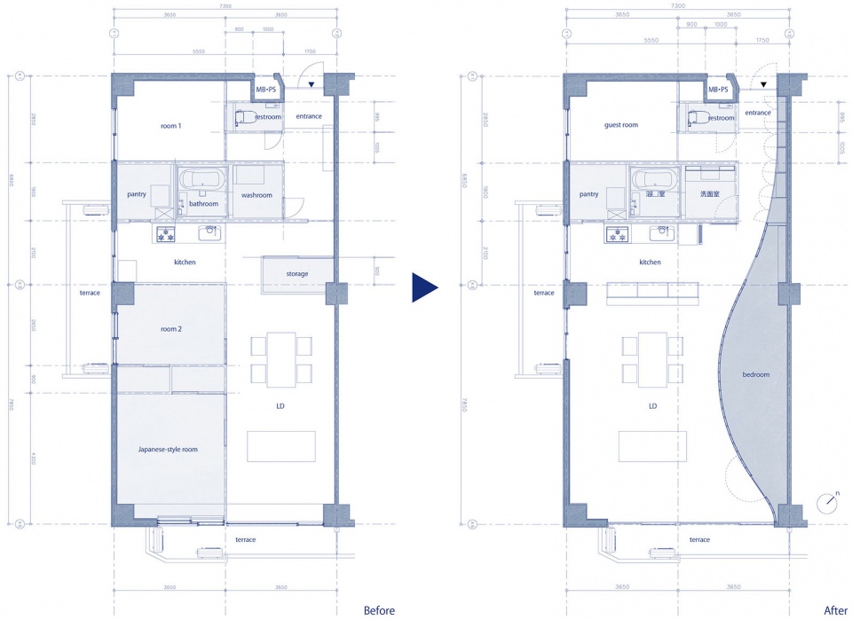 ▼修改前平面图(左)修改后平面图(右),plan before and after © suzuki architects