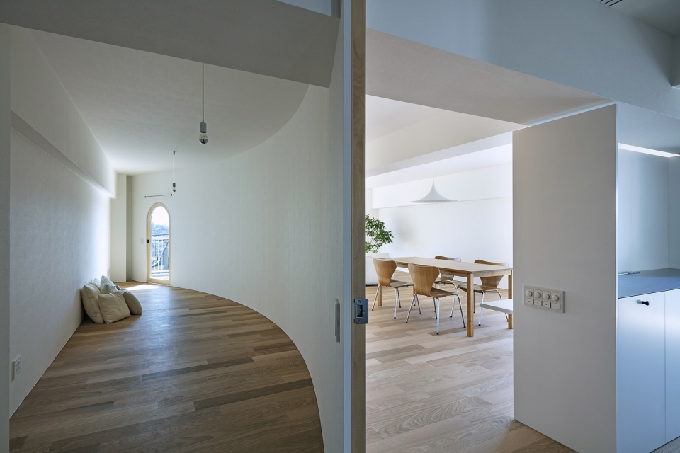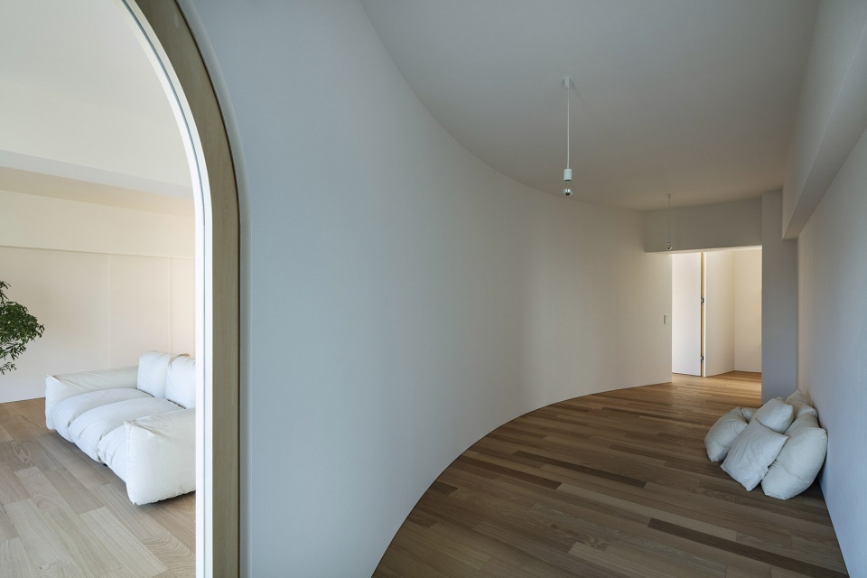▼卧室,以弧形墙面和起居空间分隔,bedroom, separated by the curving wall and the living space © Kenta Hasegawa