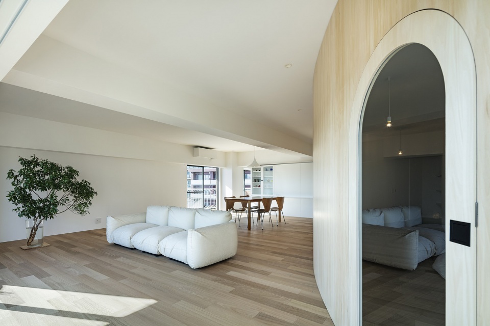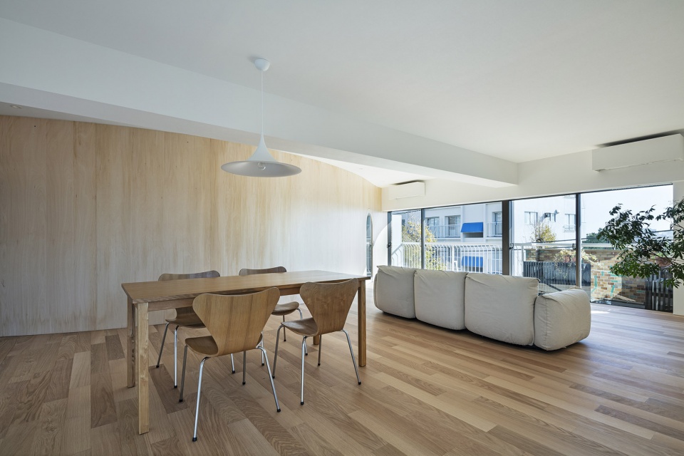On the living-dining room side, the wall surface is made of linden plywood with a glossy finish for reflectivity. Sunlight and exterior scenery are mirrored on the wood, turning it into an abstract plane that melds easily into everyday life and provides a sense of the outdoor environment. On the bedroom side, the wall is finished with a non-reflective covering. The small, arched glass door to the bedroom limits visual information from the outside, contributing to the calm atmosphere.