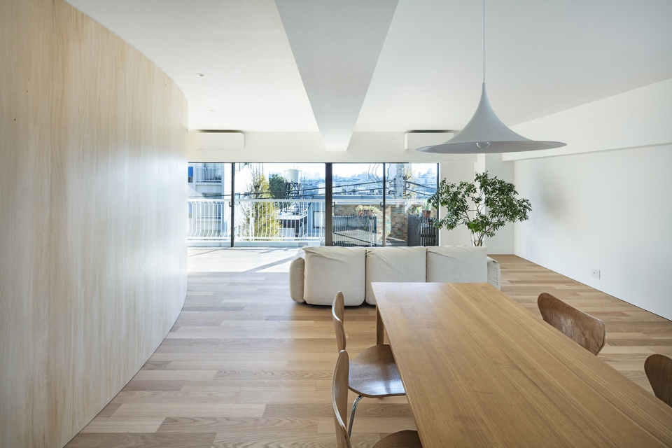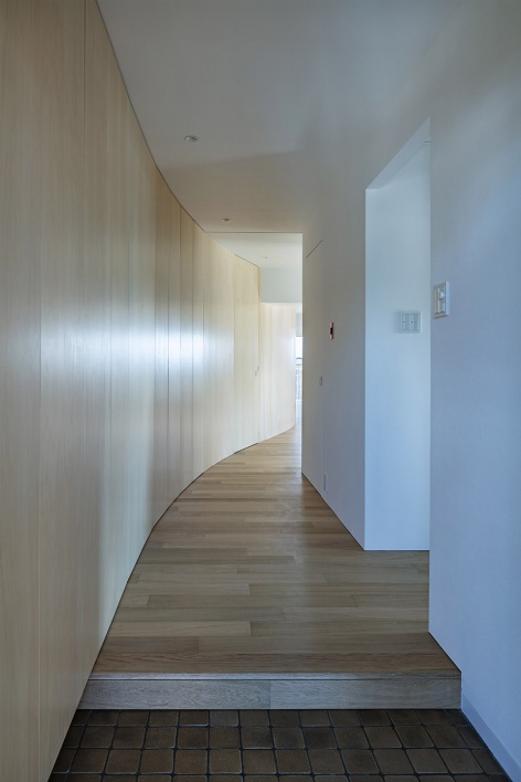 For this condominium renovation, the client requested an open and bright space to use as a second home, studio, and gallery. We faced two design problems. First, due to the long, narrow layout that emphasized efficient use of space, the entryway was dark. Second, the windows could not be modified because they are considered shared property belonging to the building as a whole, which made creating an open-feeling space difficult. We responded by installing a curving wooden wall throughout the length of the apartment from the entryway to the balcony, bringing elements of the exterior inside through the wall’s reflective surface and thereby making the entire space open and bright.
