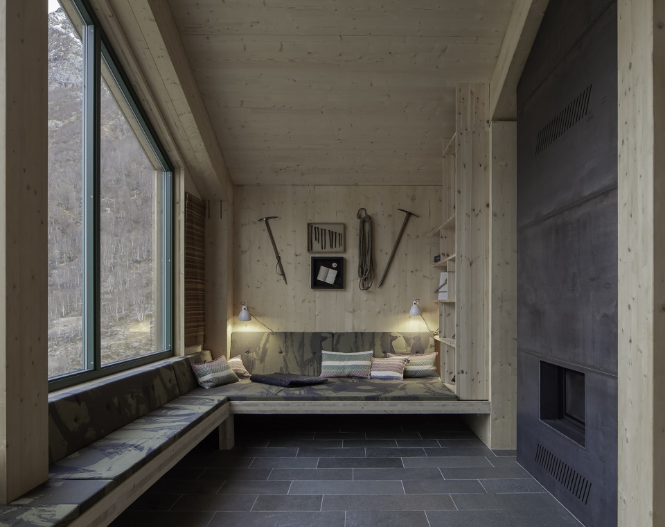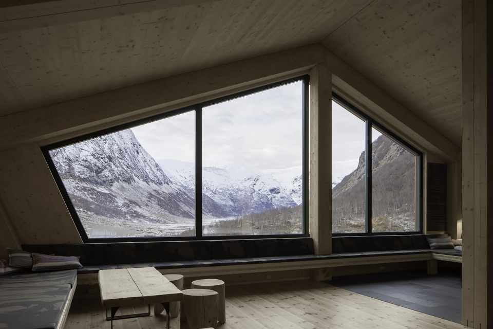 在室内,木屋俏皮的造型通过棱角分明的全景窗将室外的山脉和山谷框住,在增强空间视野和光线的同时,也为游客的沉思和放松提供了条件。主要的小屋内有带宽敞木桌的温馨空间,非常适合集体用餐。最高处的天花板高达4.6米,形成了一个可以远眺周围景观的开阔社交场所。舒适的休息室带有大型石质壁炉,让游客在时而寒冷的夏季也能抵挡室外的低温。