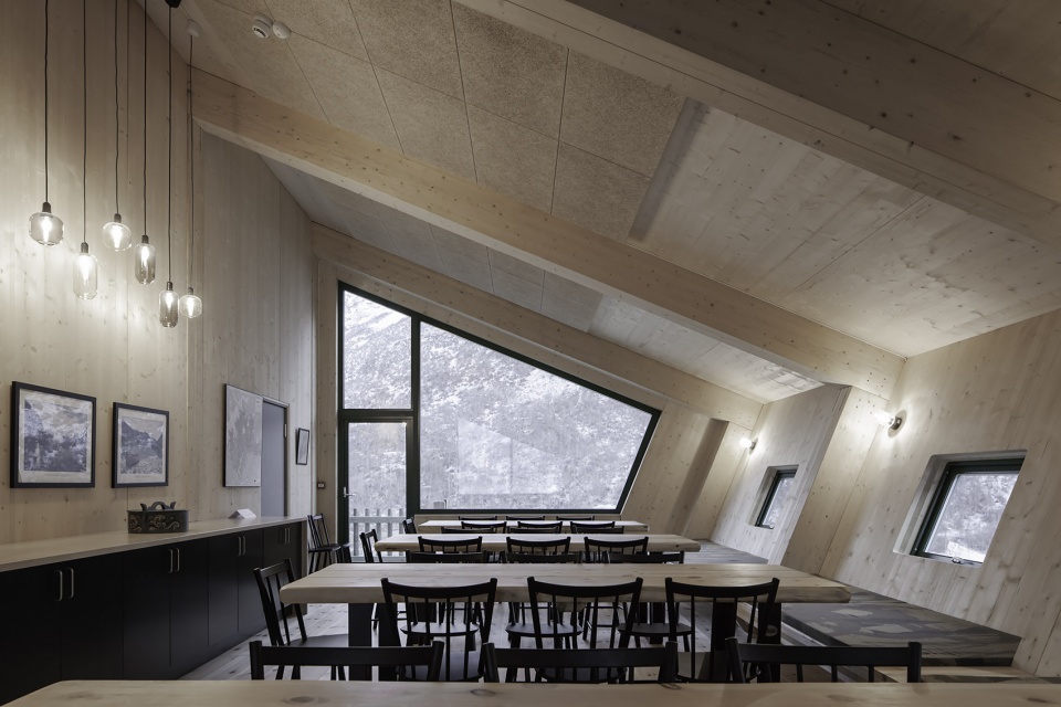 On Christmas Day 2011 the original Tungestølen Tourist Cabin, which had served as an important destination for avowed glacier hikers for more than a century, was completely devastated by the cyclone Dagmar that swept over Norway and neighboring countries. Determined to replace the old cabin, Luster Turlag (a local branch of the Norwegian National Trekking Association) and the small local village of Veitastrond, mobilized to collect funds for the rebuild and initiated an international architectural competition that Snøhetta won in 2015.