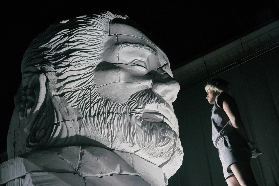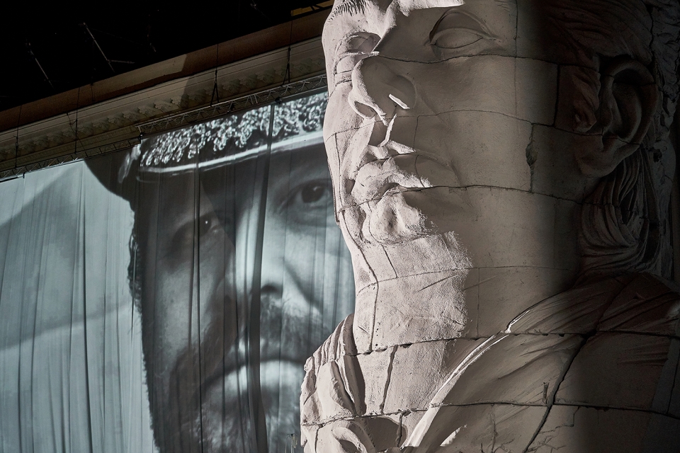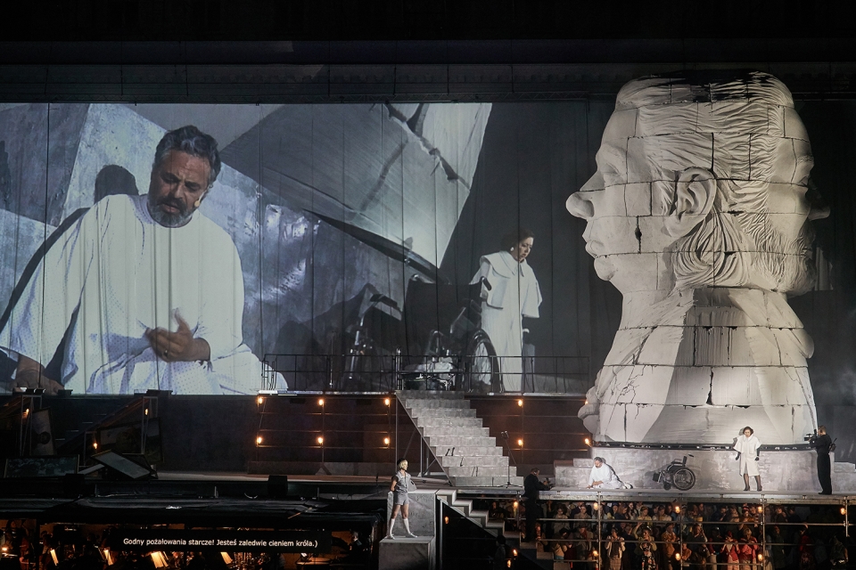 Stage is designed as an urban landscape with levels, platforms and stairs – a spatial continuation of Wroclaw opera façade that has been transformed into temple of art referring to libretto’s Temple of Solomon. It is attacked by a regime of Babylonians who want to exterminate a nation means by destroying the symbols of its cultural heritage. Just as to depose a dictator means to destroy his monuments. Colorful image of stage gradually fades into grayness once Nabucco takes over the building andculminates in 2nd part of opera when Abigaile becomes political leader – the whole building is covered with grey curtain.Giant two-face sculpture of 2,5t weight and 12m height is made with facial expressions of Nabucco / Abigaile soloists – Krum Galabov / Anna Lichorowicz. Sculpture responds to ongoing events on the stage: rotates, cries, shines light through cracks and collapses at the end of the performance.
